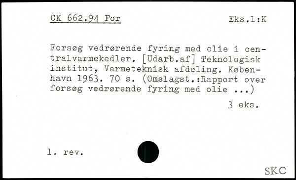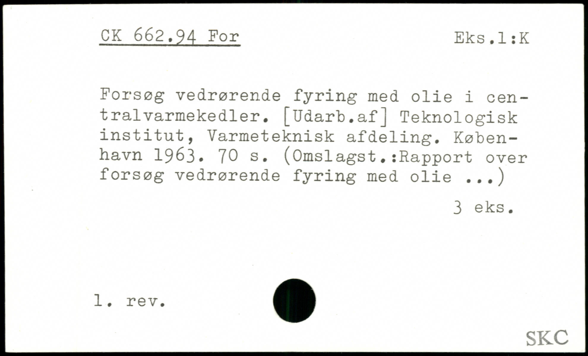 Forsøg vedrørende fyring med olie i centralvarmekedler. [Udarb.af] Teknologisk institut, Varmeteknisk afdeling.