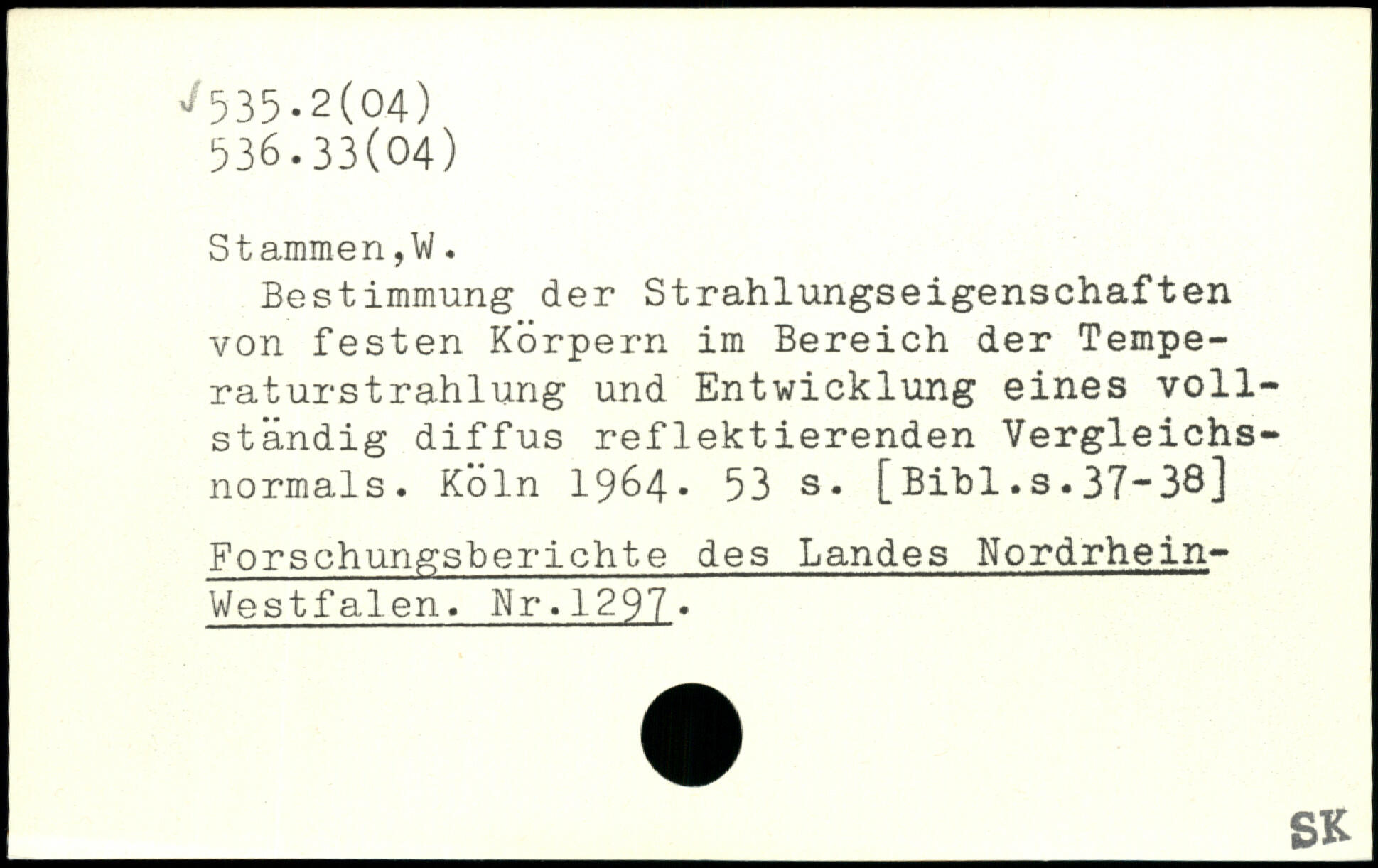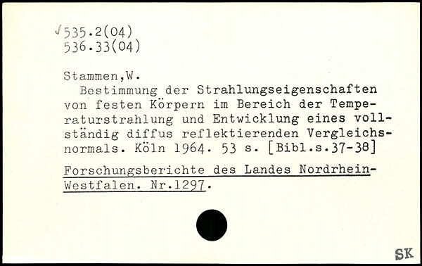 Bestimmung der Strahlungseigenschaften von festen Körpern im Bereich der Temperaturstrahlung und Entwicklung eines vollständig diffus reflektierenden Vergleichsnormals. Köln 19ö4.
