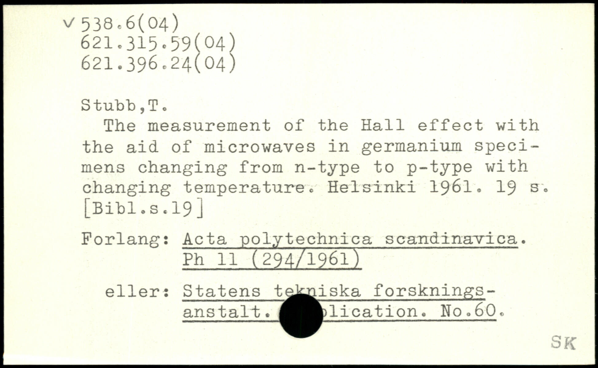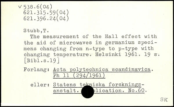 The measurement of the Hall effect with the aid of microwaves in germanium specimens changing from n-type to p-type with changing temperature. Helsinki 19'6l.