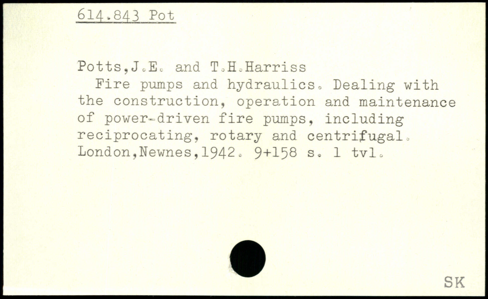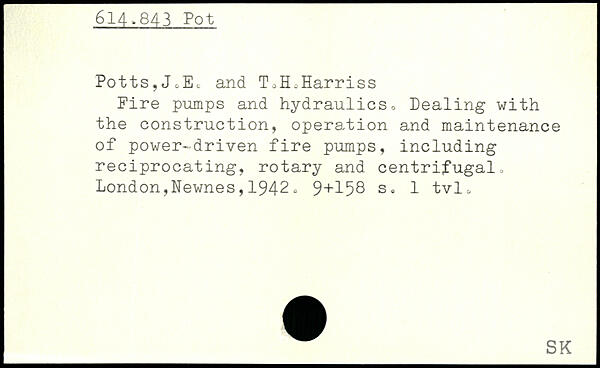 Potts?JoEc and ToH.Harriss Fire pumps and hydraulicso Dealing with the construction, operation and maintenance of power-driven fire pumps, including reciprocating, rotary and centrifugal