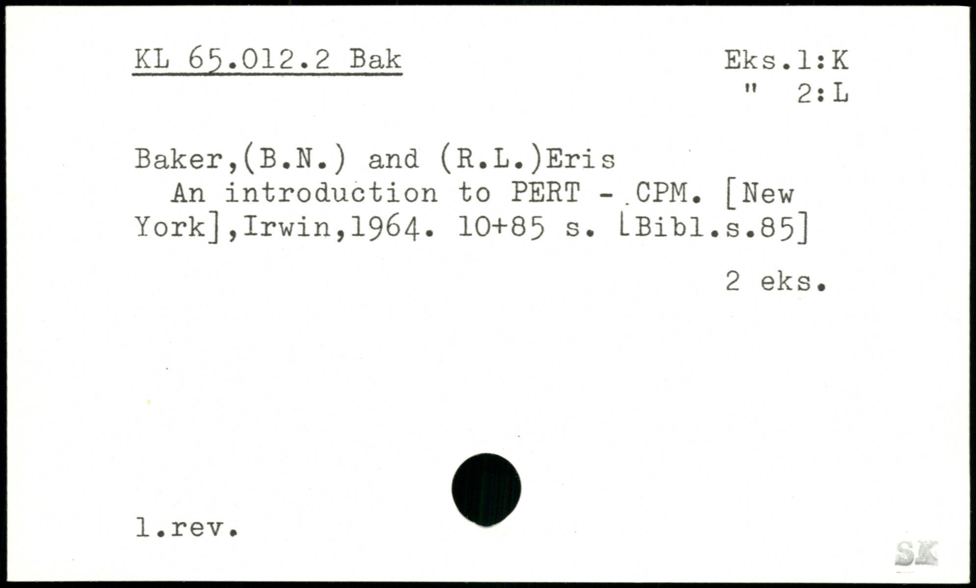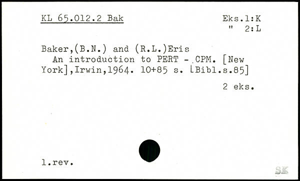 Baker,(B.N.) and (R.L.)Eris An introduction to PERT -,CPM. [New York],Irwin,1964