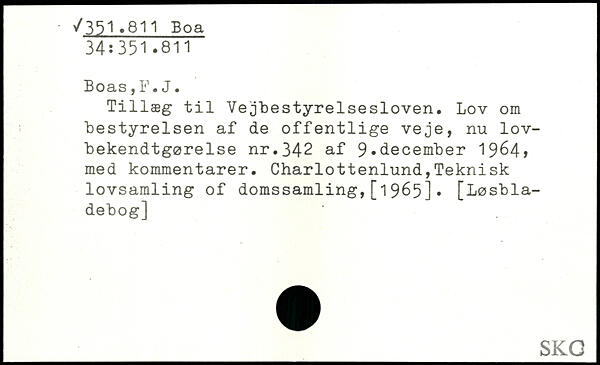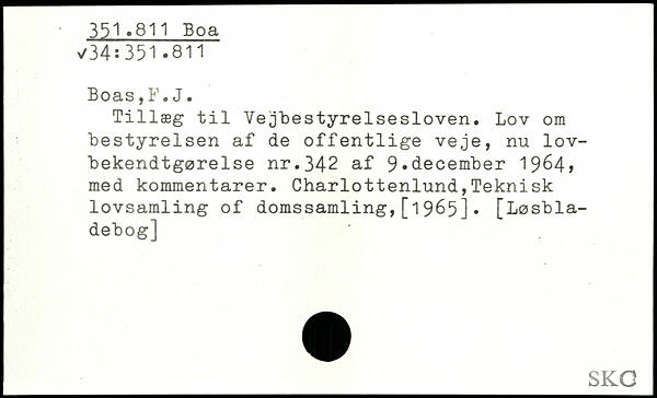 Tillæg til Vejbestyrelsesloven. Lov om bestyrelsen af de offentlige veje, nu lovbekendtgørelse nr.342 af 9,december 1964, med kommentarer.