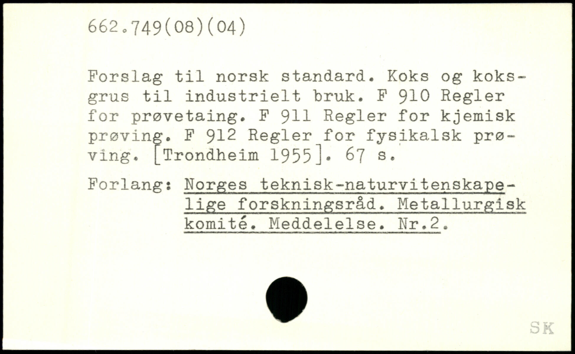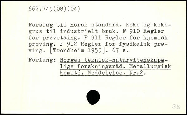 Forslag til norsk standard. Koks og koksgrus til industrielt bruk. F 910 Regler for prøvetaing. F 9H Regler for kjemisk prøving. F 912 Regler for fysikalsk prøving.