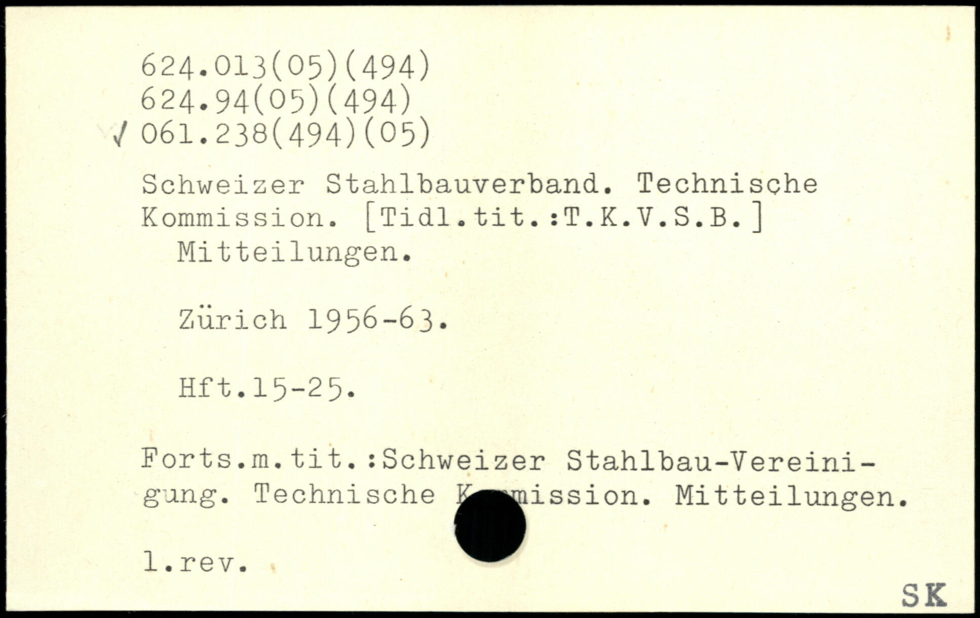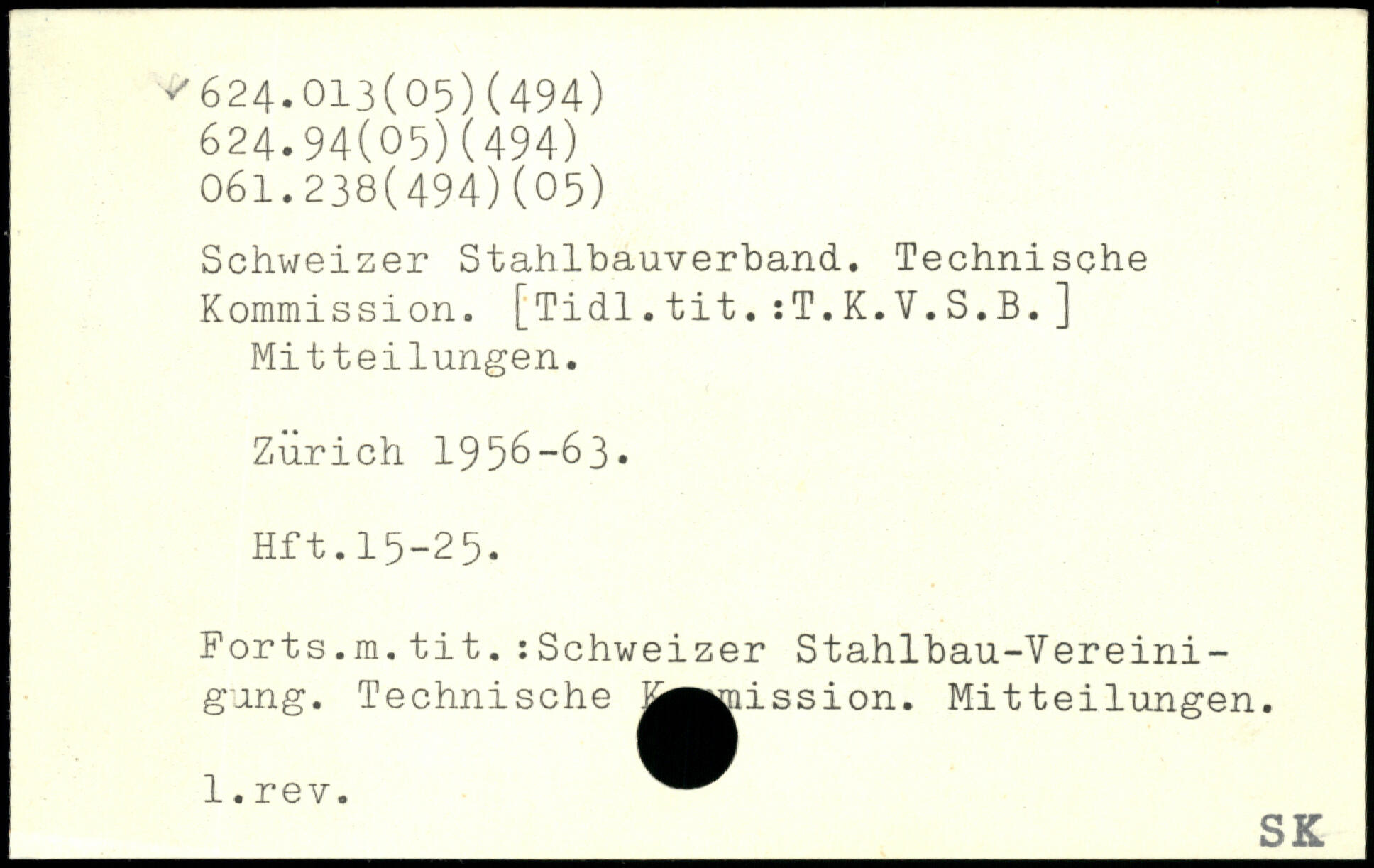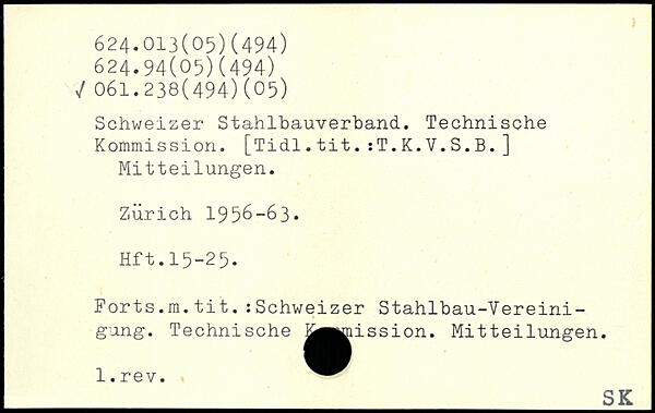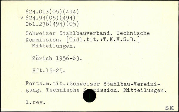 Schweizer Stahlbauverband. Technische Kommission. [Tidl.tit.:T.K.V.S.B.] Mitteilungen. Zürich 1956-63, Hft.15-25. Forts.m.tit.:Schweizer Stahlbau-Vereinigung. Technische jj^mission. Mitteilungen. l.rev.