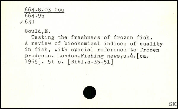 Testing the freshness of frozen fish. A review of biochemical indices of quality in fish, with special reference to frozen products. London,Fishing news,u.H.[ca. 1965]