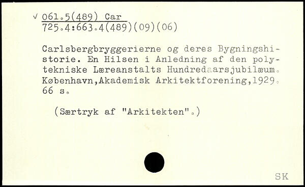 Carlsbergbryggenerne og deres Bygningshistorie. En Hilsen i Anledning af den polytekniske Læreanstalts Hundredaarsjubilæum, København,Akademisk Arkitektforening,19^9 o