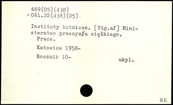 Institute hutnicze. [Udg.af] Mini-sterstwo przemys/u ciçzkiego. Prace. Katowice 1958- Rocznik 10- , n ukpl.