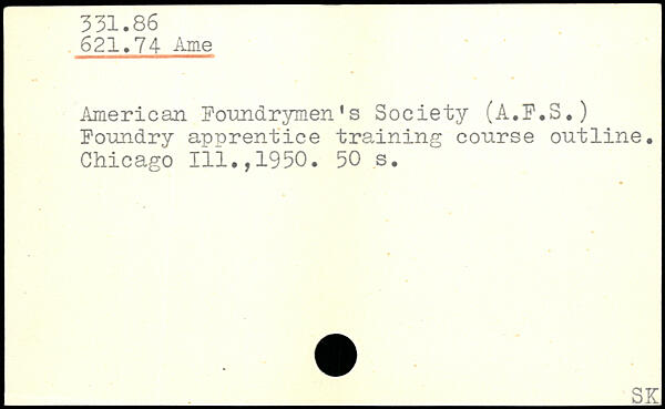 American FoimcLryinen.s Society (A.F.S.) Foundry apprentice training coiirse outline, Chicago 111,,1950.