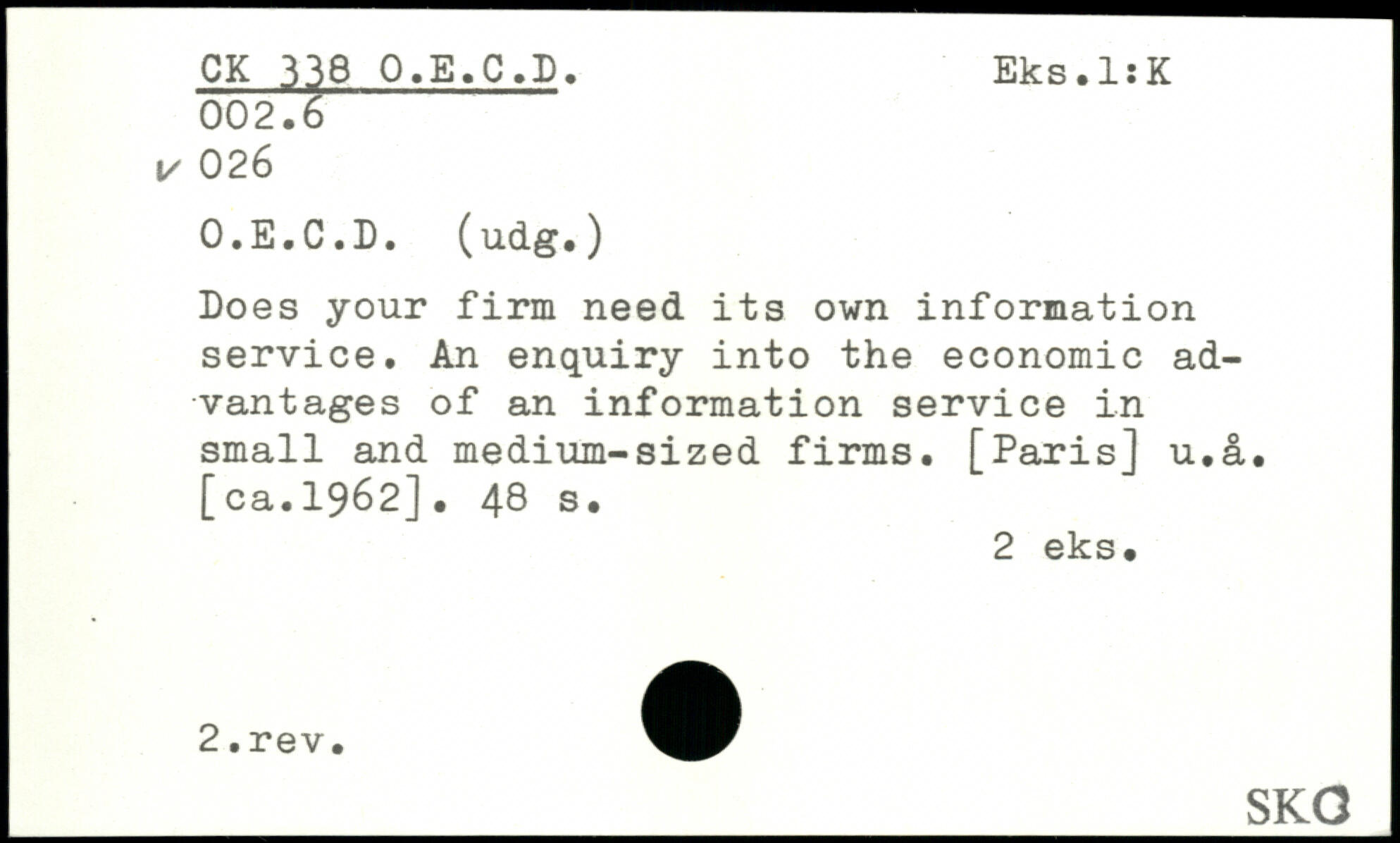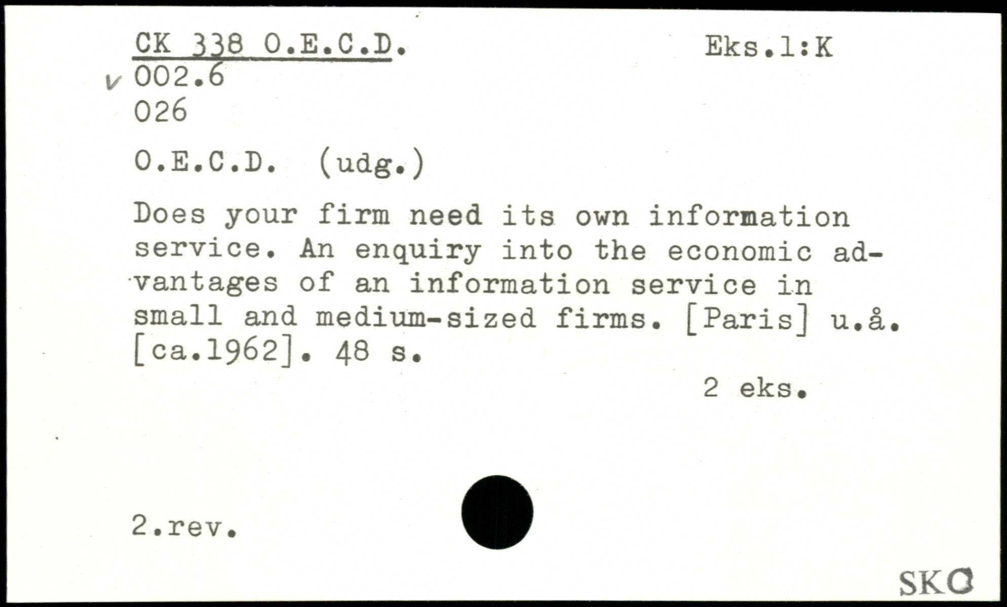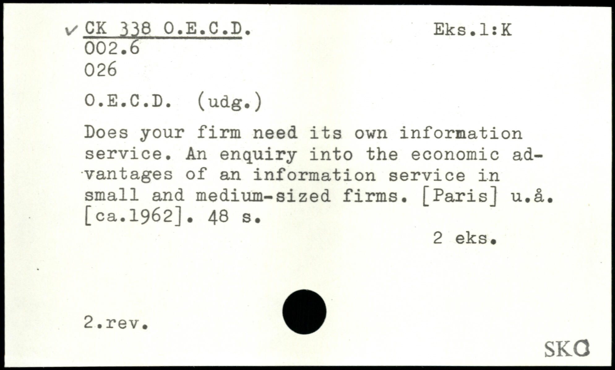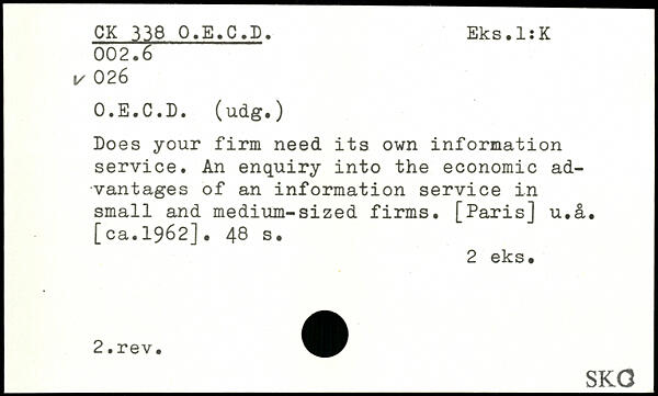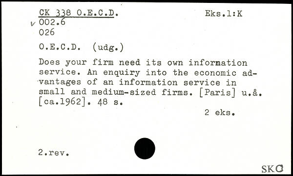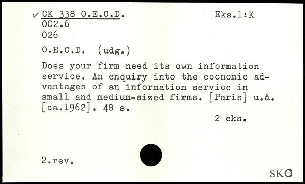Does your firm need its own information service. An enquiry into the economic advantages of an information service in small and medium-sized firms. [Paris] u.a. [ca.1962].