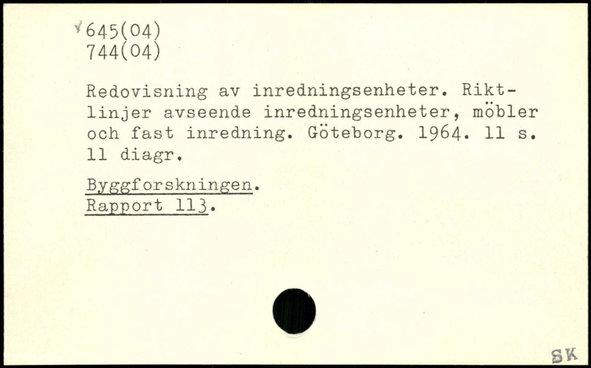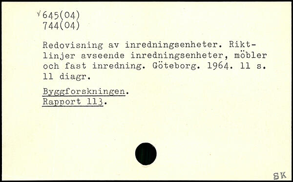Redovisning av inredningsenheter. Riktlinjer avseende inredningsenheter, möbler och fast inredning. Göteborg. 1964.