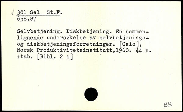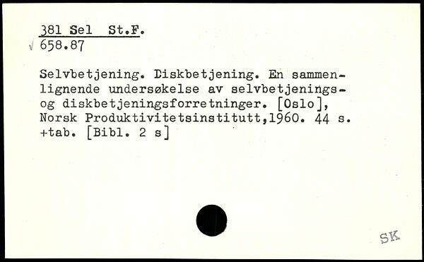 Selvbetjening. Diskbetjening. En sammenlignende undersøkelse av selvbetjenings-og diskbetjeningsforretninger. [Oslo], Norsk Produktivitetsinstitutt,1960.