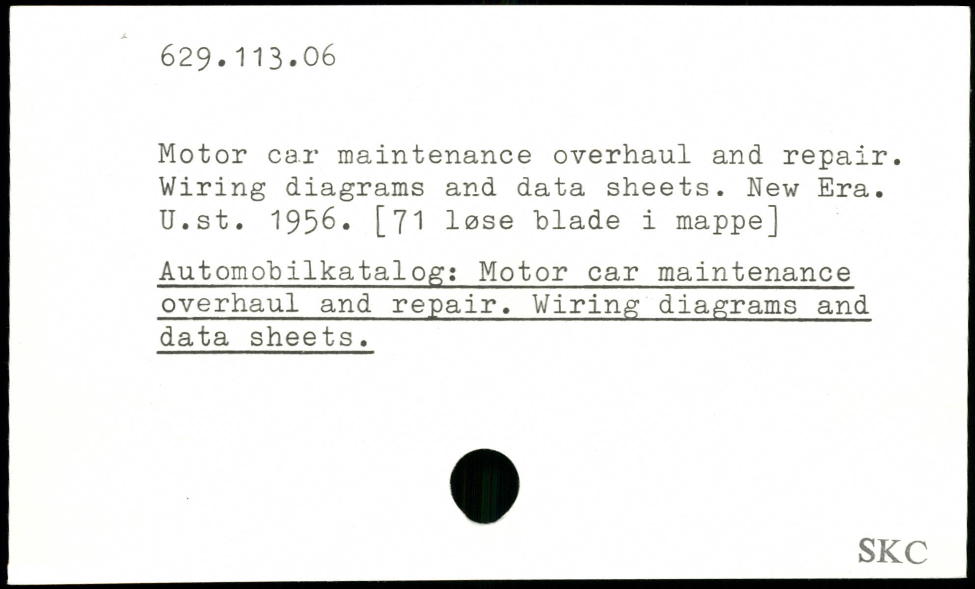 Motor car maintenance overhaul and repair. Wiring diagrams and data sheets. New Era. U.st. 1956. [71 løse blade i mappe] Automobilkatalog: Motor car maintenance overhaul and repair. Wiring diagrams and data sheets.