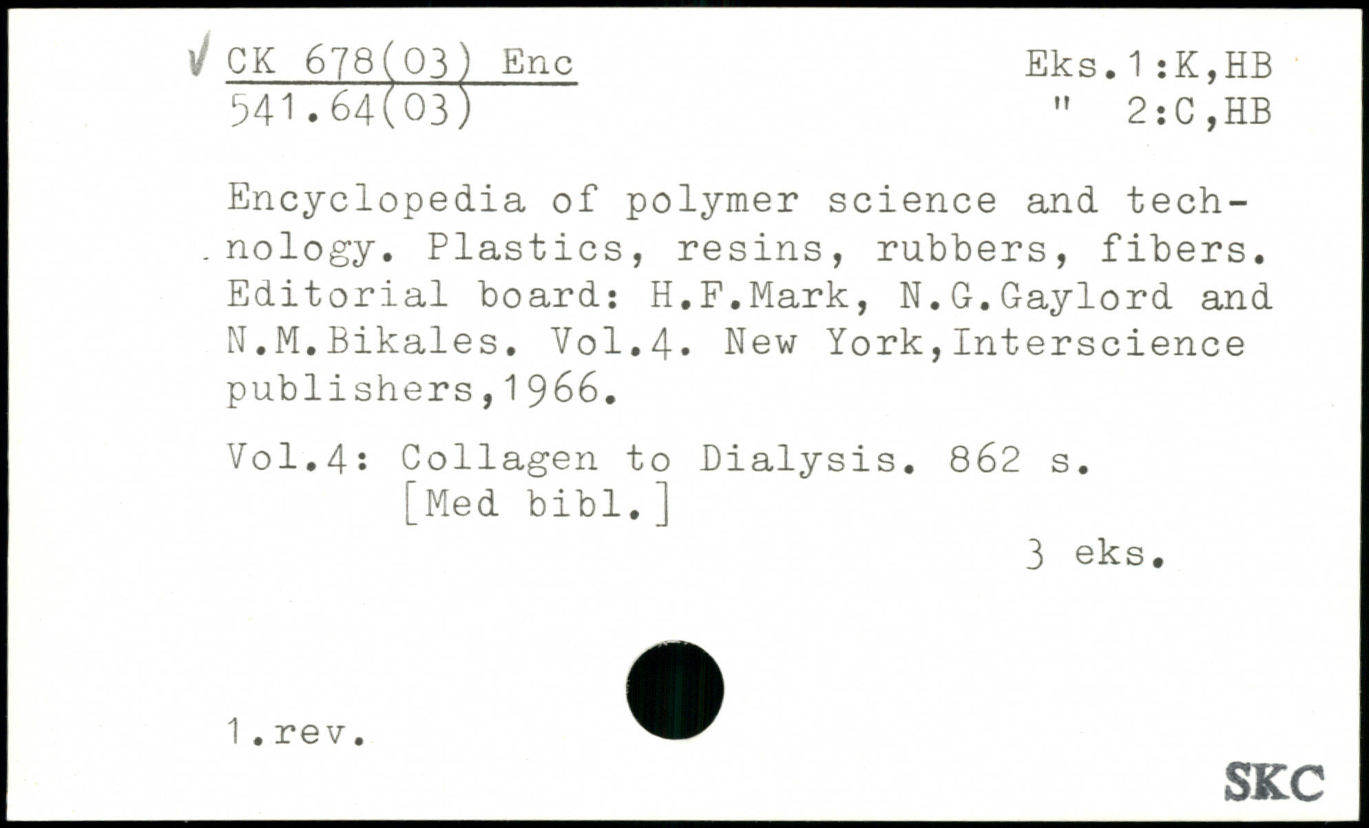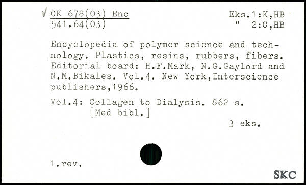 Encyclopedia of polymer science and tech-. nology. Plastics, resins, rubbers, fibers. Editorial board: H.F.Mark, N.G.Gaylord and N.M.Bikales.