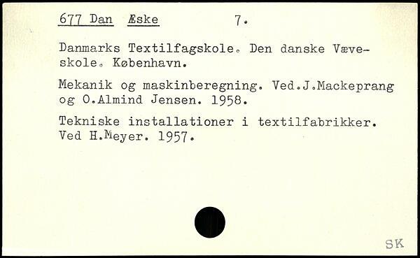 Danmarks Textilfagskole, Den danske Væveskole,, København. Mekanik og maskinberegning. Ved.J.Mackeprang og 0.Almind Jensen. 1958, Tekniske installationer i textilfabrikker. Ved H.Meyer. 1957