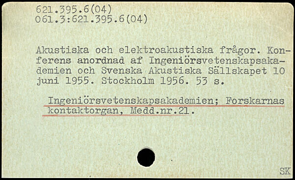 Akustiska och elektroakustiska frågor. Konferens anordnad af Ingeniörsvetenskapsaka-demien och Svenska Akustiska Sällskapet 10 juni 1955.