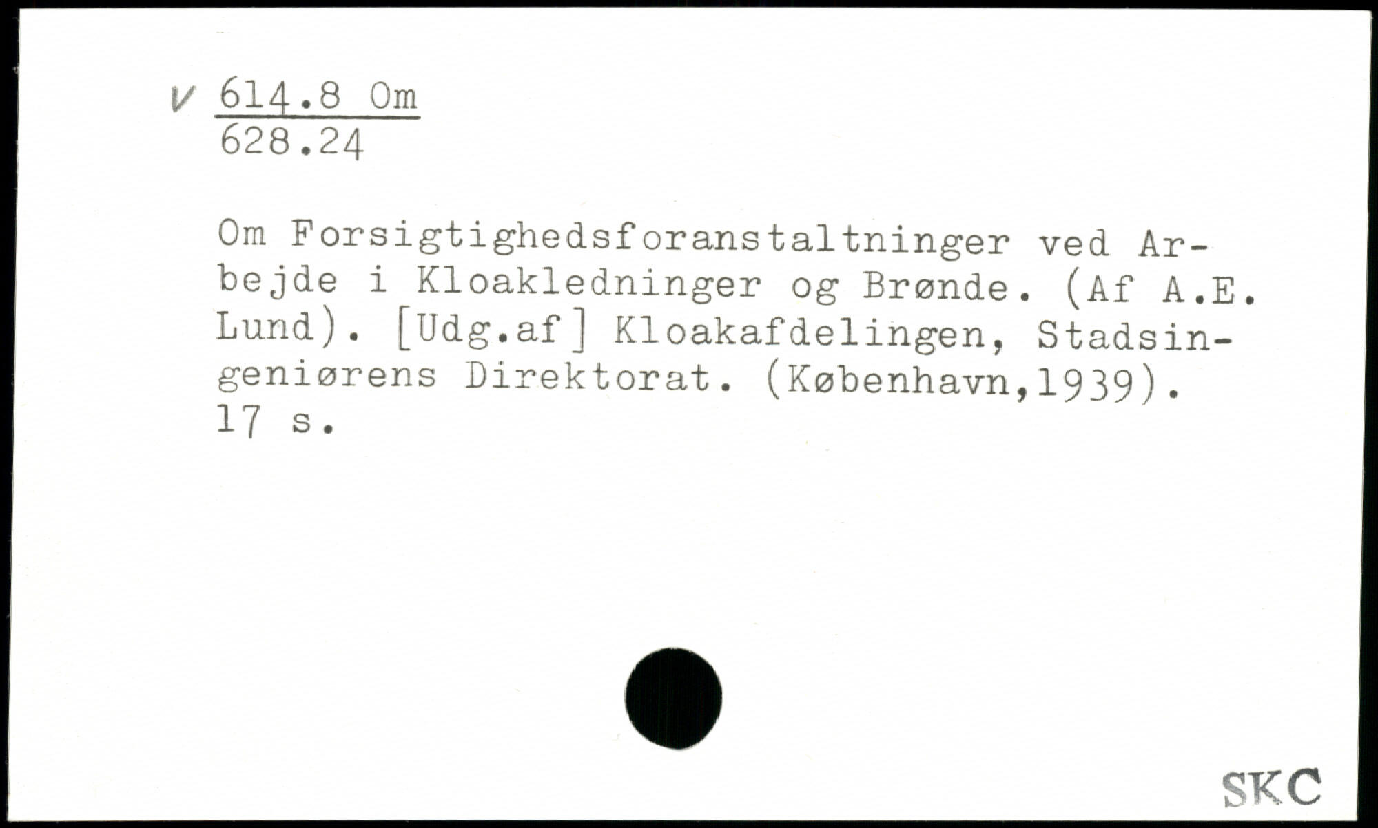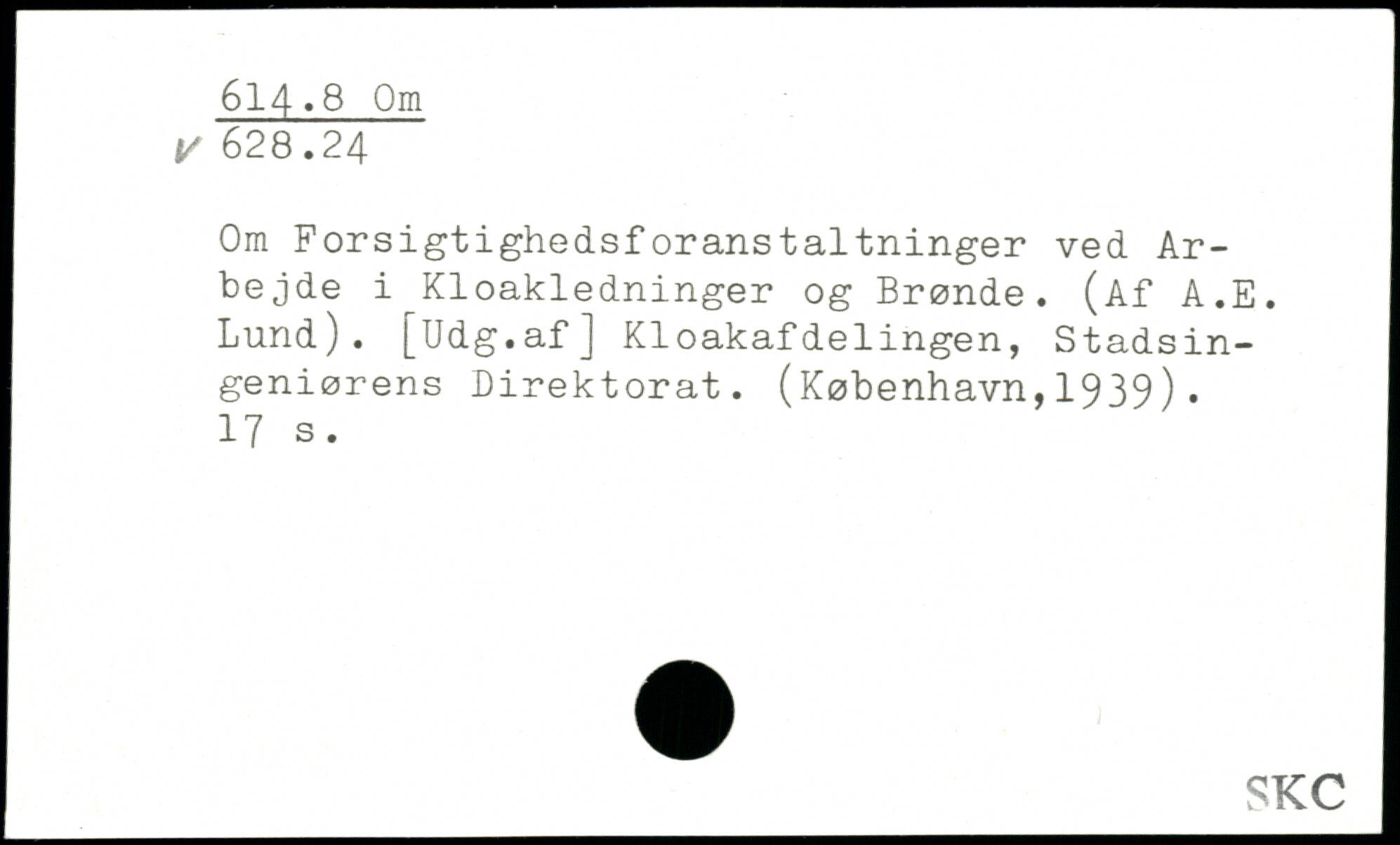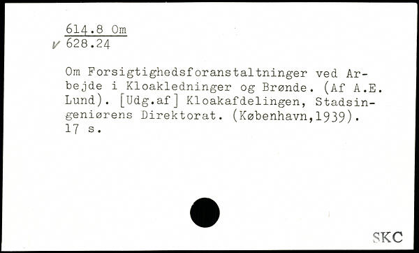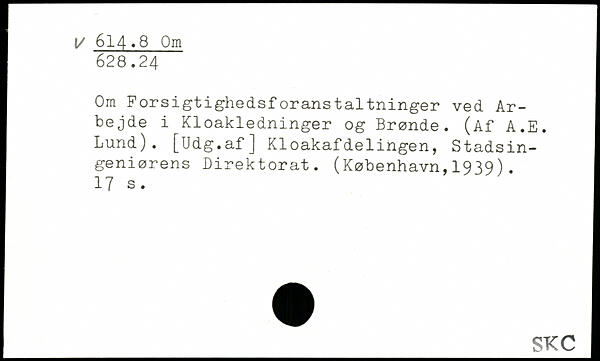 Om Forsigtighedsforanstaltninger ved Arbejde i Kloakledninger og Brønde. (Af A.E. Lund). [Udg.af] Kloakafdelingen, Stadsingeniørens Direktorat. (København,1939).