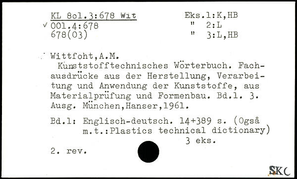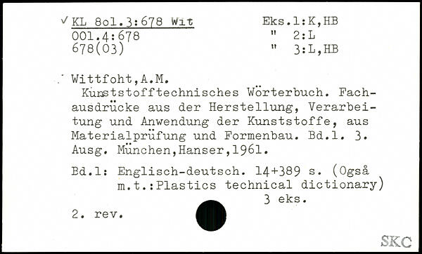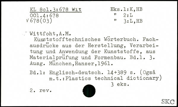 Kunststofftechnisches Wörterbuch. Fachausdrücke aus der Herstellung, Verarbeitung und Anwendung der Kunststoffe, aus Materialprüfung und Formenbau. Bd.l. 3. Ausg.