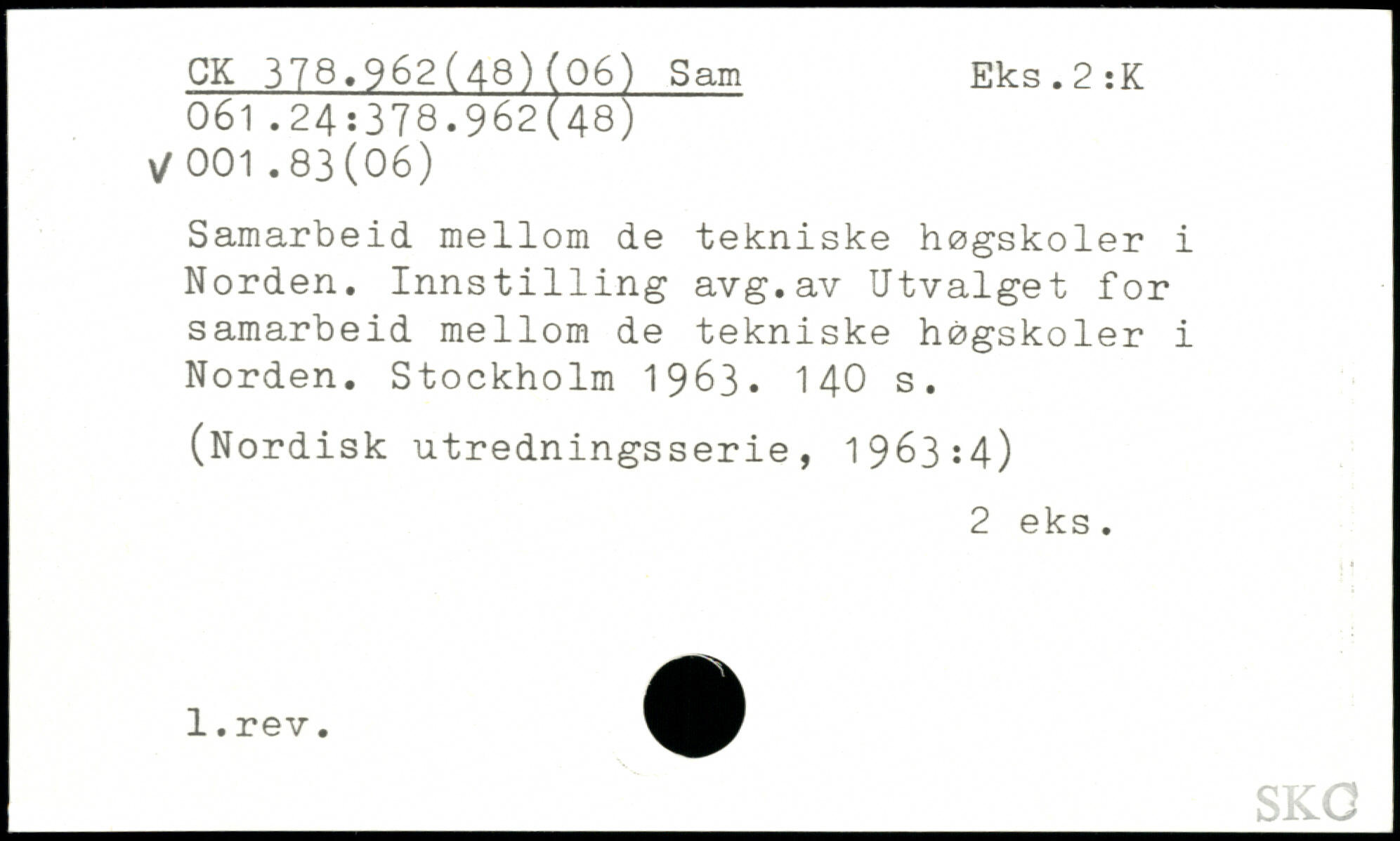 Samarbeid mellom de tekniske høgskoler i Norden. Innst1111ng avg.av Utvalget for samarbeid mellom de tekniske høgskoler i Norden.
