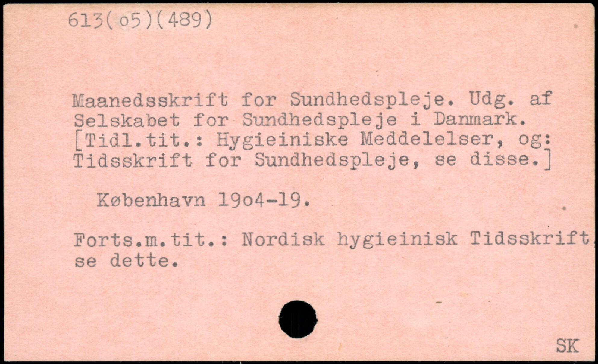 Maanedsskrift for Sundhedspleje. Udg. af Selskabet for Sundhedspleje i Danmark. [Tidl.tit.: Hygieiniske Meddelelser, og: Tidsskrift for Sundhedspleje, se disse.] København 19o4-19. Korts.m.tit.: Nordisk hygieinisk Tidsskrift se dette.