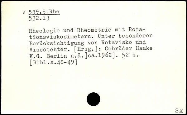 Rheologie und Rheometrie mit Rotationsviskosimetern. Unter besonderer Berücksichtigung von Rotavisko und Viscotester. [Hrsg.]: Gebrüder Haake K.G. Berlin u.ä.]ca.1962].