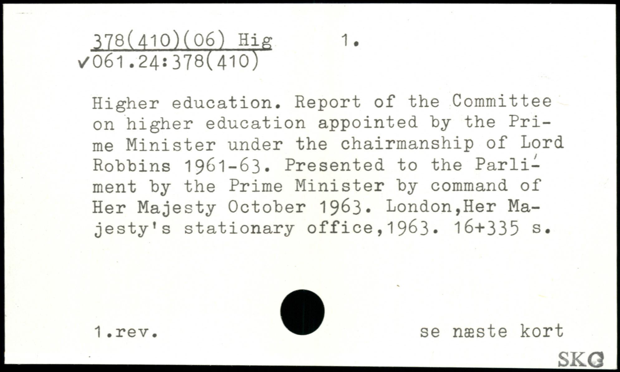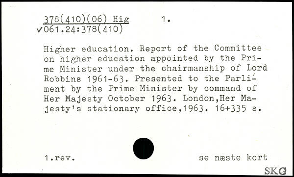 Higher education. Report of the Committee on higher education appointed by the Prime Minister under the chairmanship of Lord Robbins 1961-63. Presented to the Parli-ment by the Prime Minister by command of Her Majesty October 19^3. London,Her Majesty’s stationary office,19&3