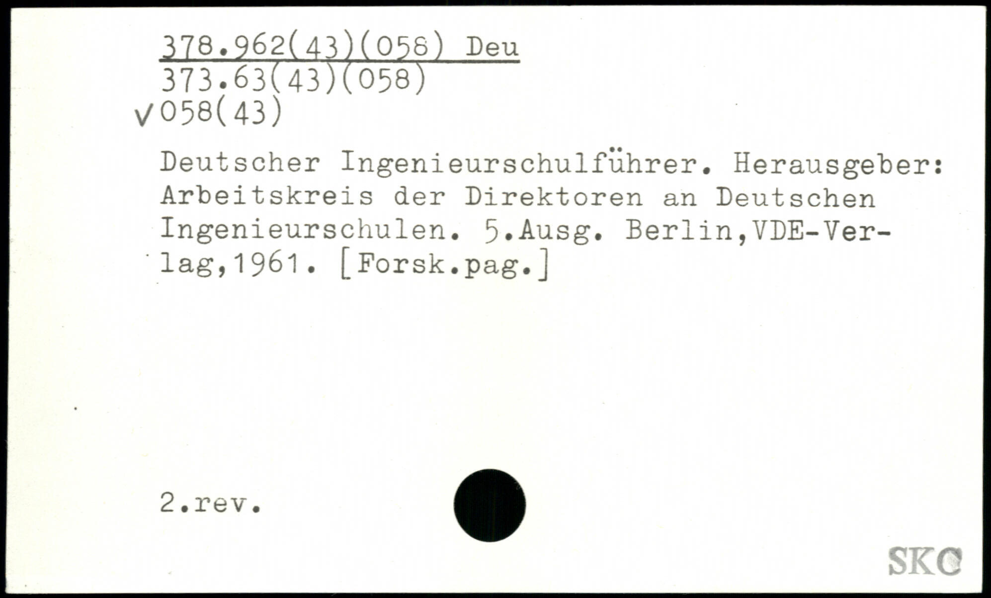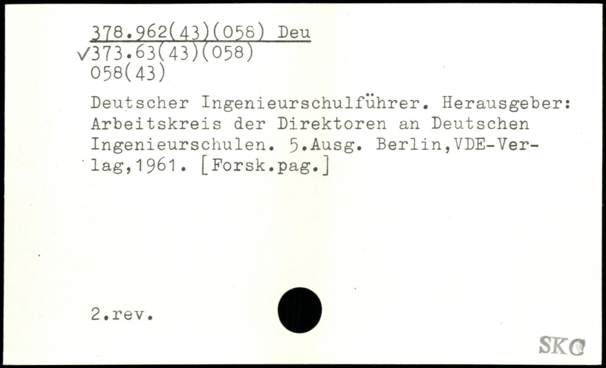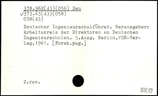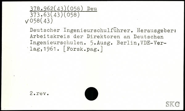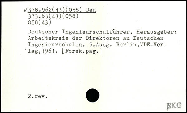 Deutscher Ingenieurschulführer. Herausgeber: Arbeitskreis der Direktoren an Deutschen Ingenieurschulen. 5,Ausg. Berlin,VDE-Ver-'lag,1961.