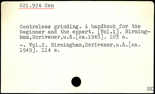Centreless grinding. A handbook for the beginner and the expert. [Vol.l]. Birmingham, Scrivener,u.A.[ca.1945].