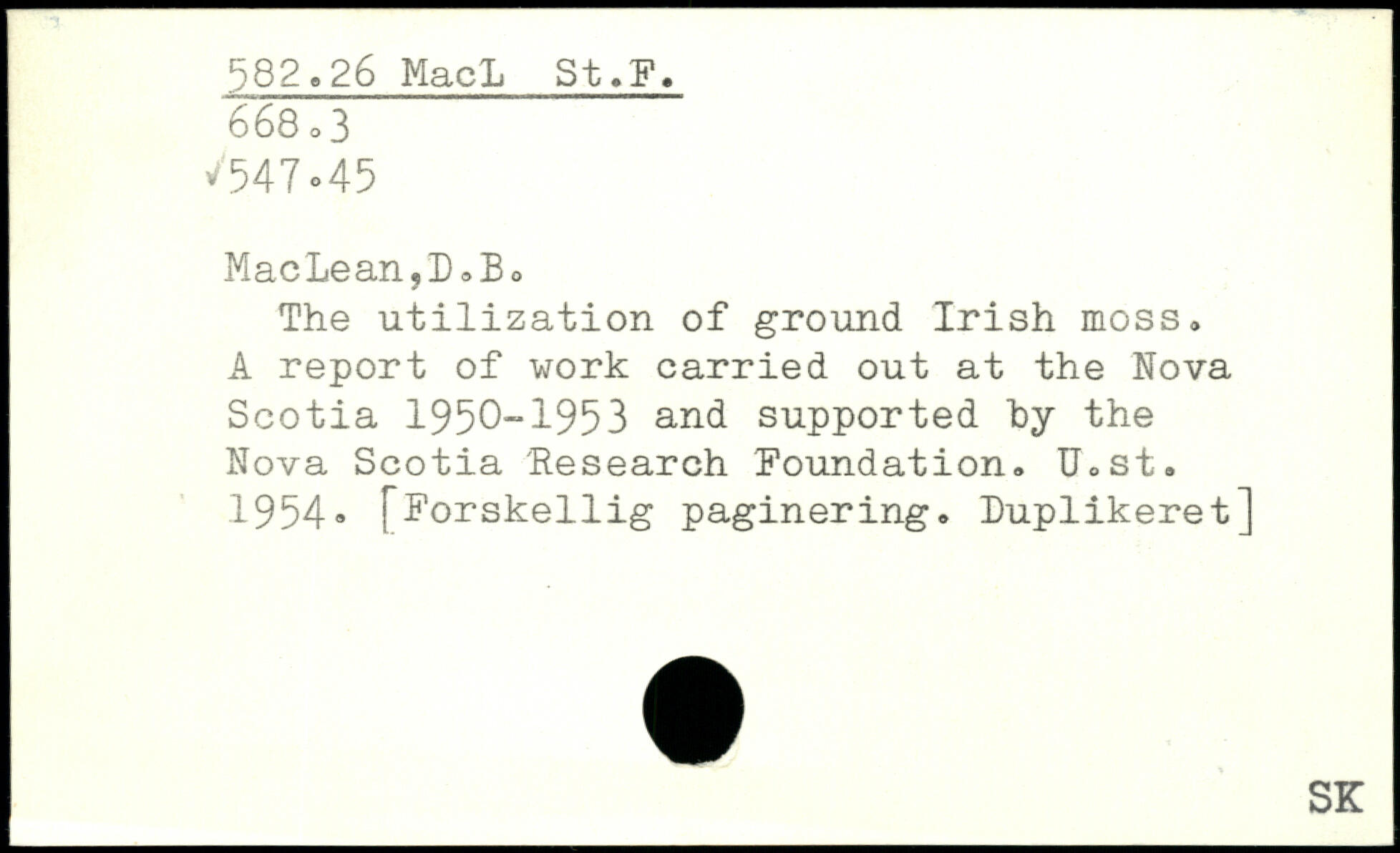 The utilization of ground Irish moss, A report of work carried out at the Nova Scotia 1950-1953 and supported hy the Nova Scotia 'Research Foundation, U,st. 1954, [Forskellig paginering. Duplikeret]
