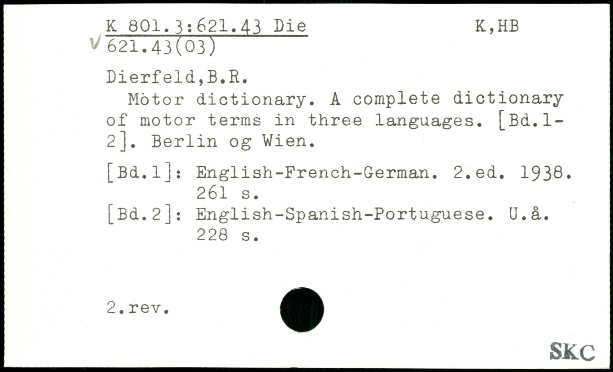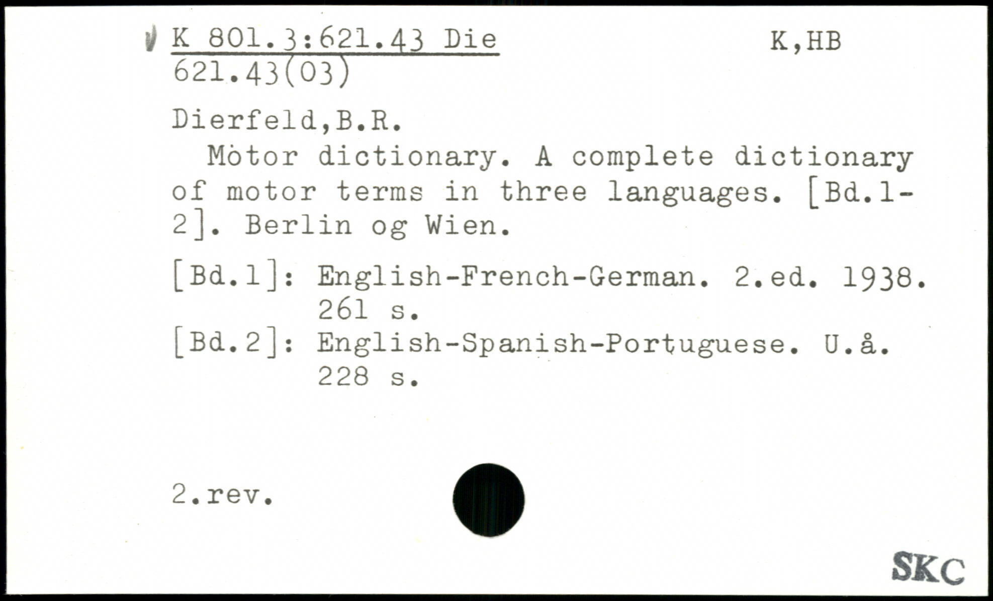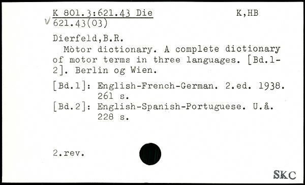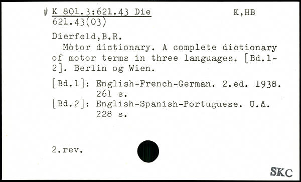 Motor dictionary. A complete dictionary of motor terms in three languages. [Bd.l-2]. Berlin og Wien.