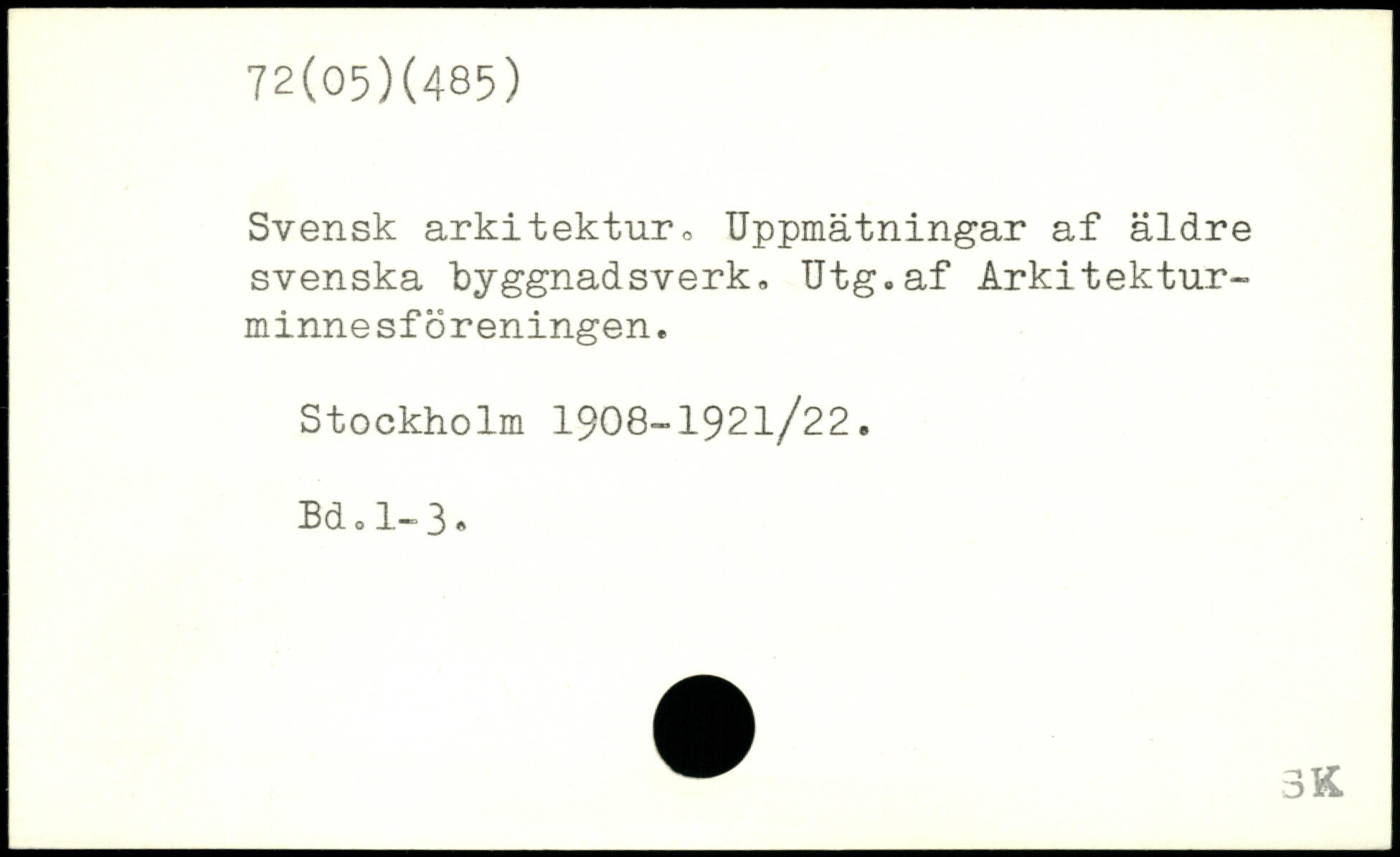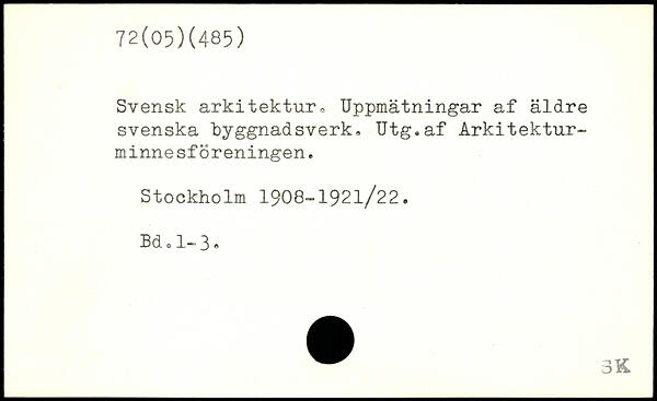 Svensk arkitektur, Uppmätningar af äldre svenska byggnadsverk. Utg.af Arkitekturminne sföreningen.