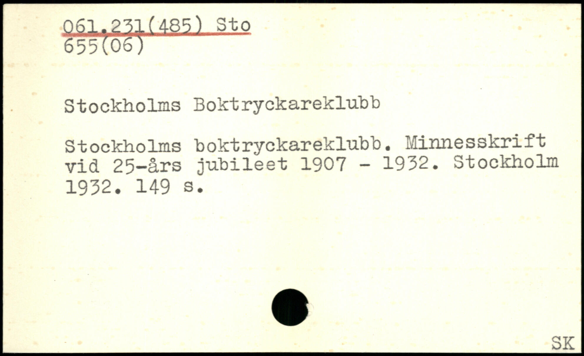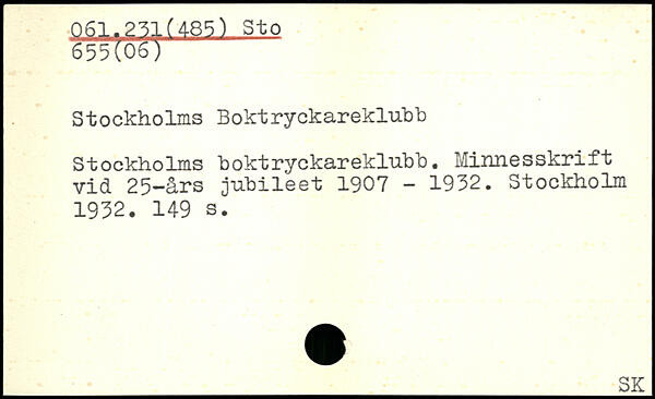 Stockholms Boktryckareklut)b Stockholms boktryckareklubb. Minnesskrift vid 25-års jubileet 1907 - 1932.