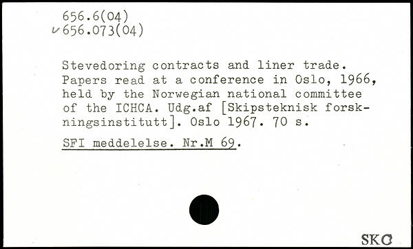 Stevedoring contracts and liner trade. Papers read at a conference in Oslo, 1966, held by the Norwegian national committee of the ICHCA. Udg.af [Skipsteknisk forskningsinstitut! ]. Oslo 1967.