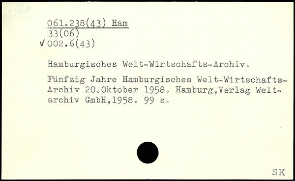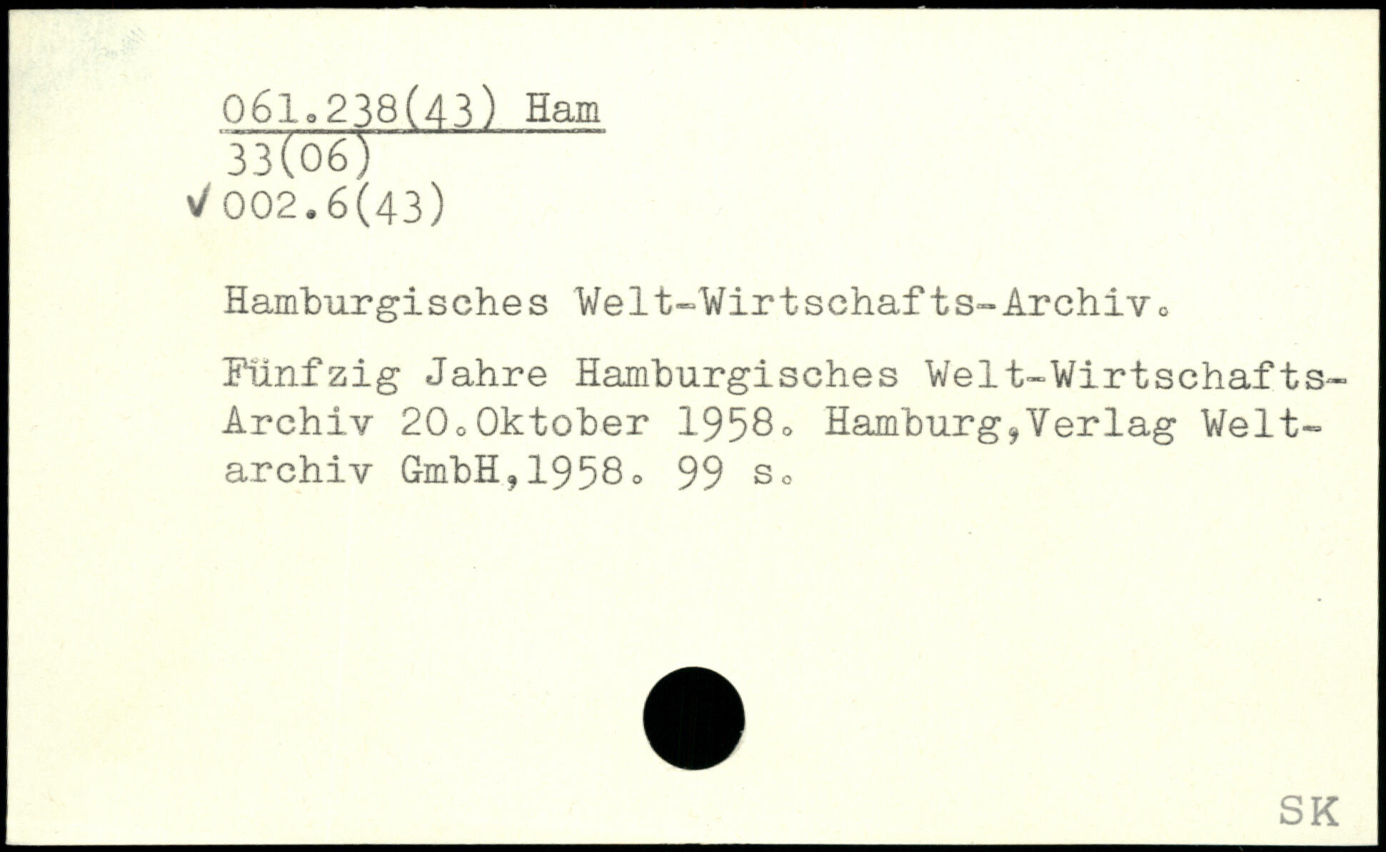 Hamburgisches We1t~Virtschafts-Archiv, Fünfzig Jahre Hamburgisches Welt-Virtschafts-Archiv 20o0ktober 1958.