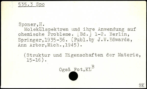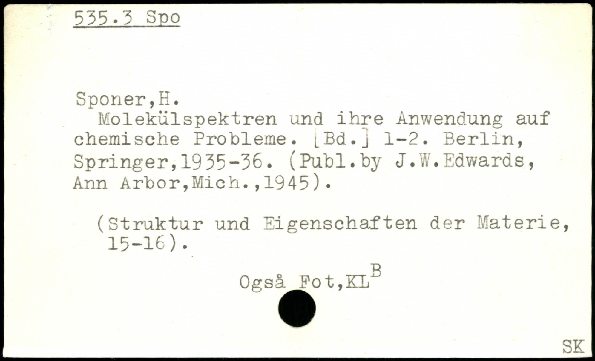 Molekülspektren und ihre Anwendung auf chemische Probleme. |_Bd.} 1-2.
