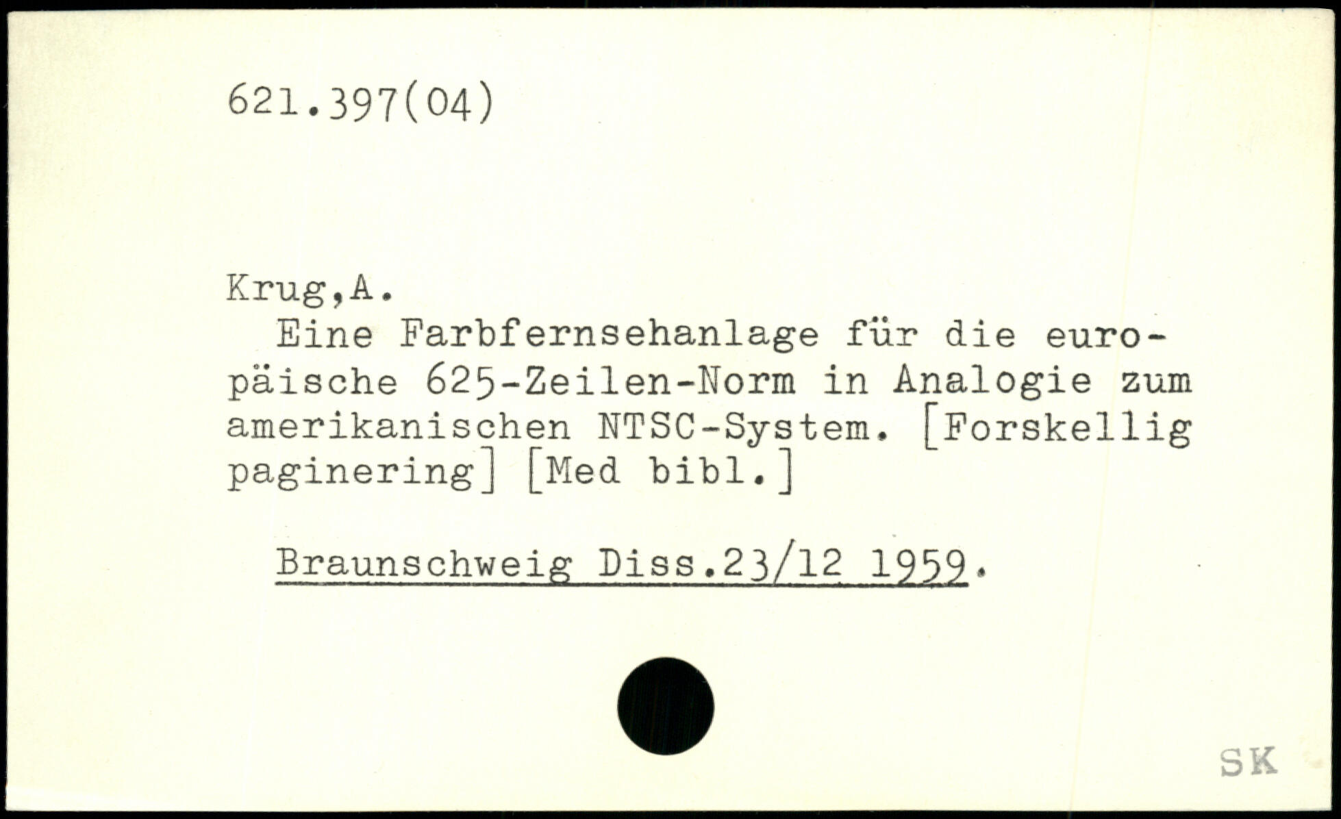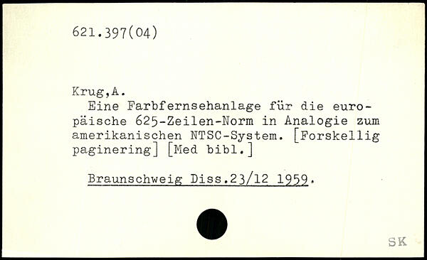 Eine Farbfernsehanlage für die europäische 625-Zeilen-Norm in Analogie zum amerikanischen NTSC-System, [Porskellig paginering] [Med bibl.] Braunschweig Diss.23/l2 1959