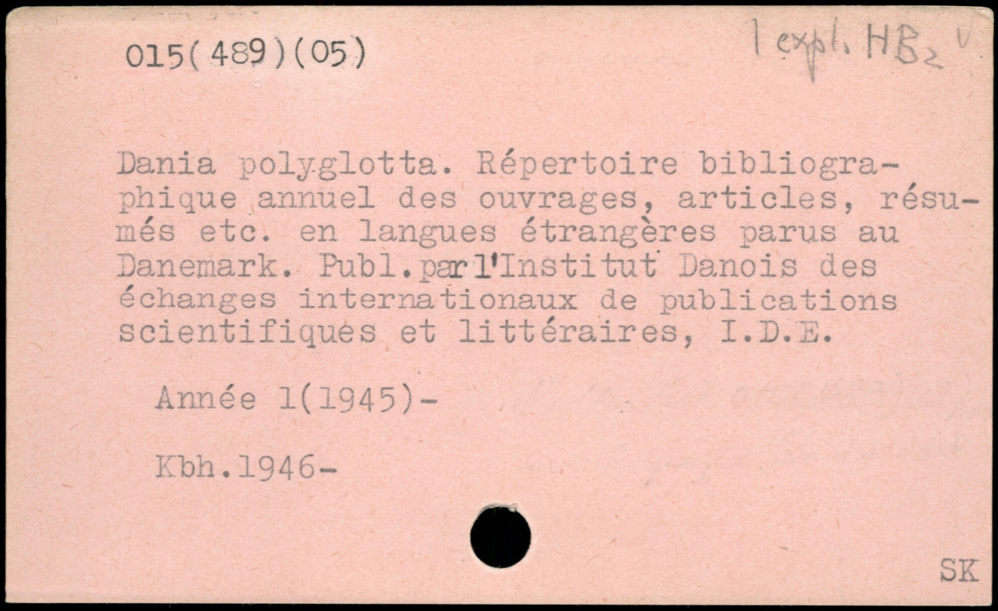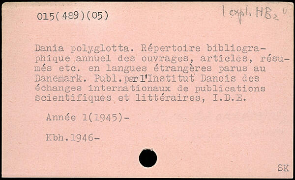 Dania polyglotta. Répertoire bibliographique annuel des ouvrages, articles, résumés etc. en langues étrangères parus au Danemark. Publ. par ^Institut’ Danois des échanges internationaux de publications scientifiques et littéraires, I.D.'E. Année 1(1945)- Kbh.1946- W SK