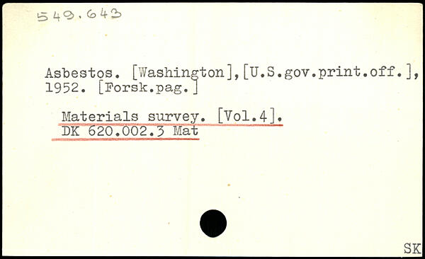 Asbestos. [Washington],[U.S.gov.print.off.], 1952. [Porsk.pag.] Materials survey. [V0I.4]. _SK
