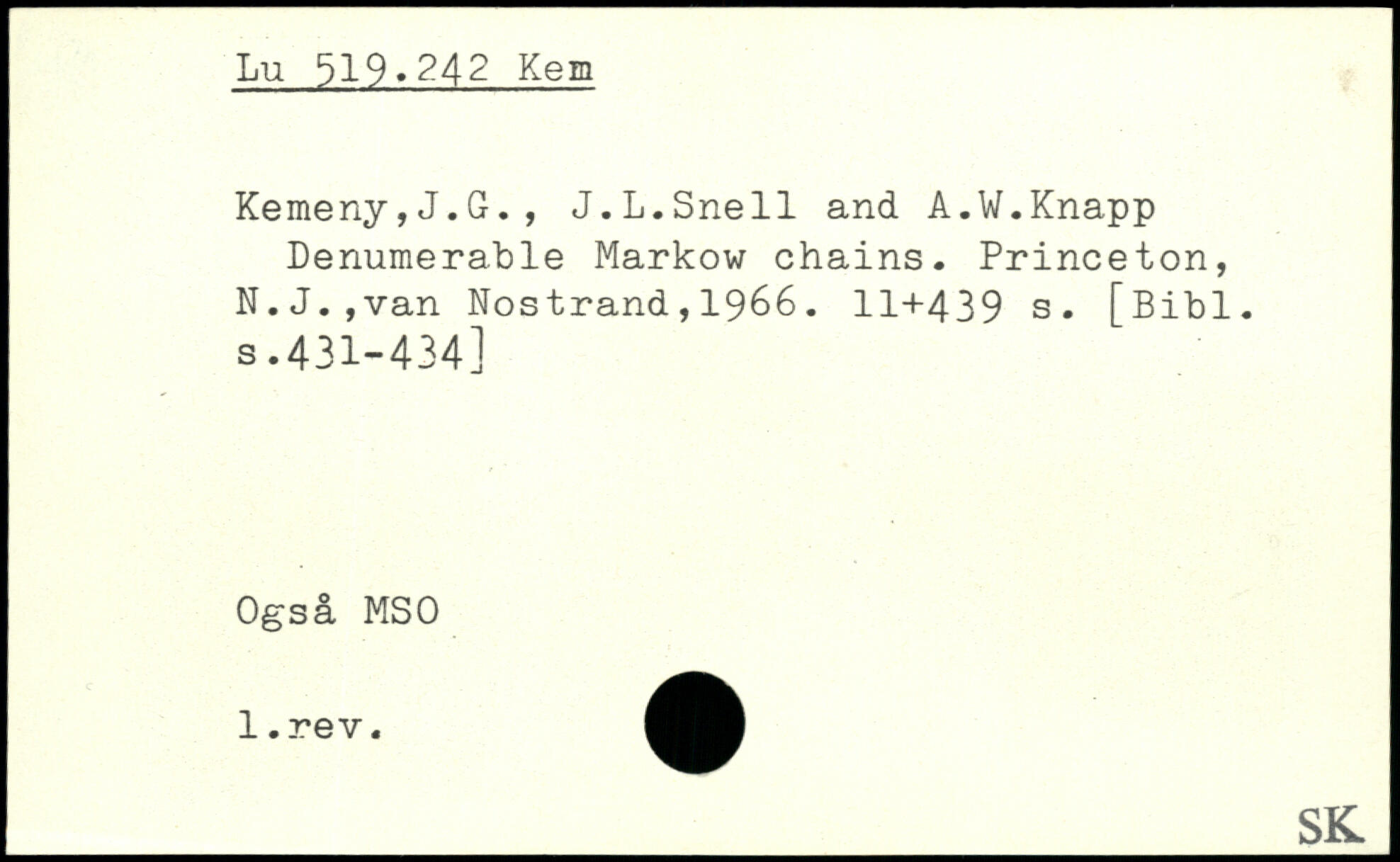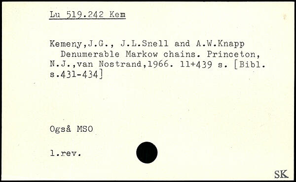 Kemeny,J.G., J.L.Snell and A.W.Knapp Denumerable Markow chains. Princeton, N.J.,van Nostrand,1966.