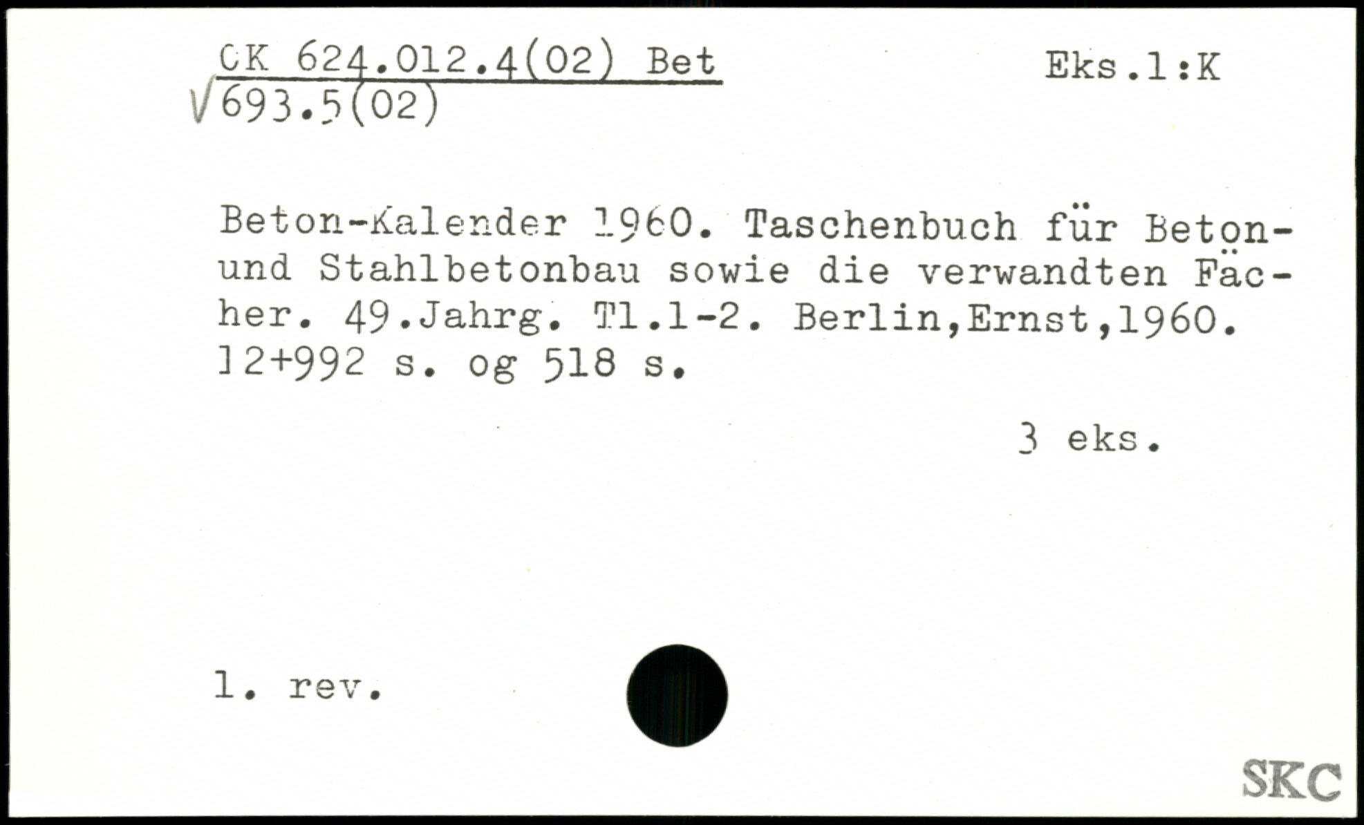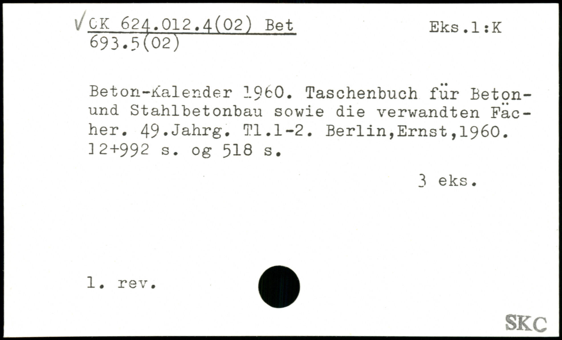 Beton-Kalender 1960. Taschenbuch für Beton-und Stahlbetonbau sowie die verwandten Facher. 49,Jahrg. TI.1-2.