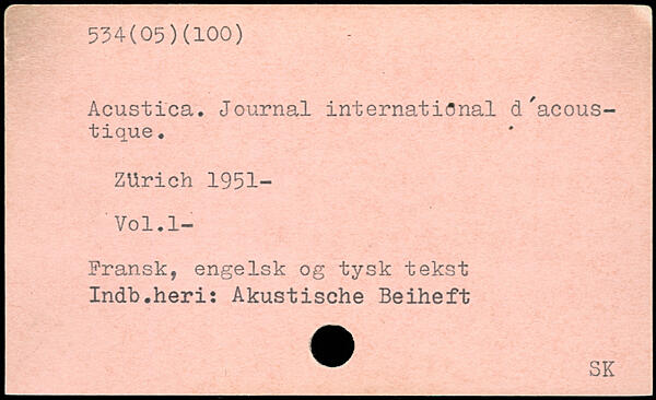 Acustica. Journal international d'acoustique, Zürich 1951-Vol.l- Fransk, engelsk og tysk tekst Indb.heri: Akustische Beiheft