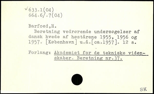 Beretning vedrørende undersøgelser af dansk hvede af høstårene 1955, 1956 og 1957. [København] u,åc [ca<,1957] 0