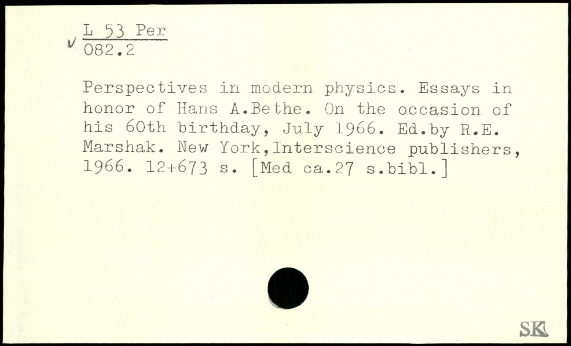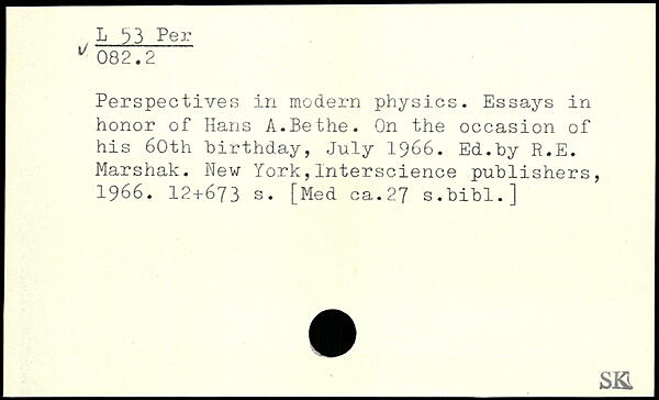 Perspectives in modern physics. Essays in honor of Hans A.Be the. On the occasion of his 60th birthday, July 1966. Ed.by R.E. Marshak.