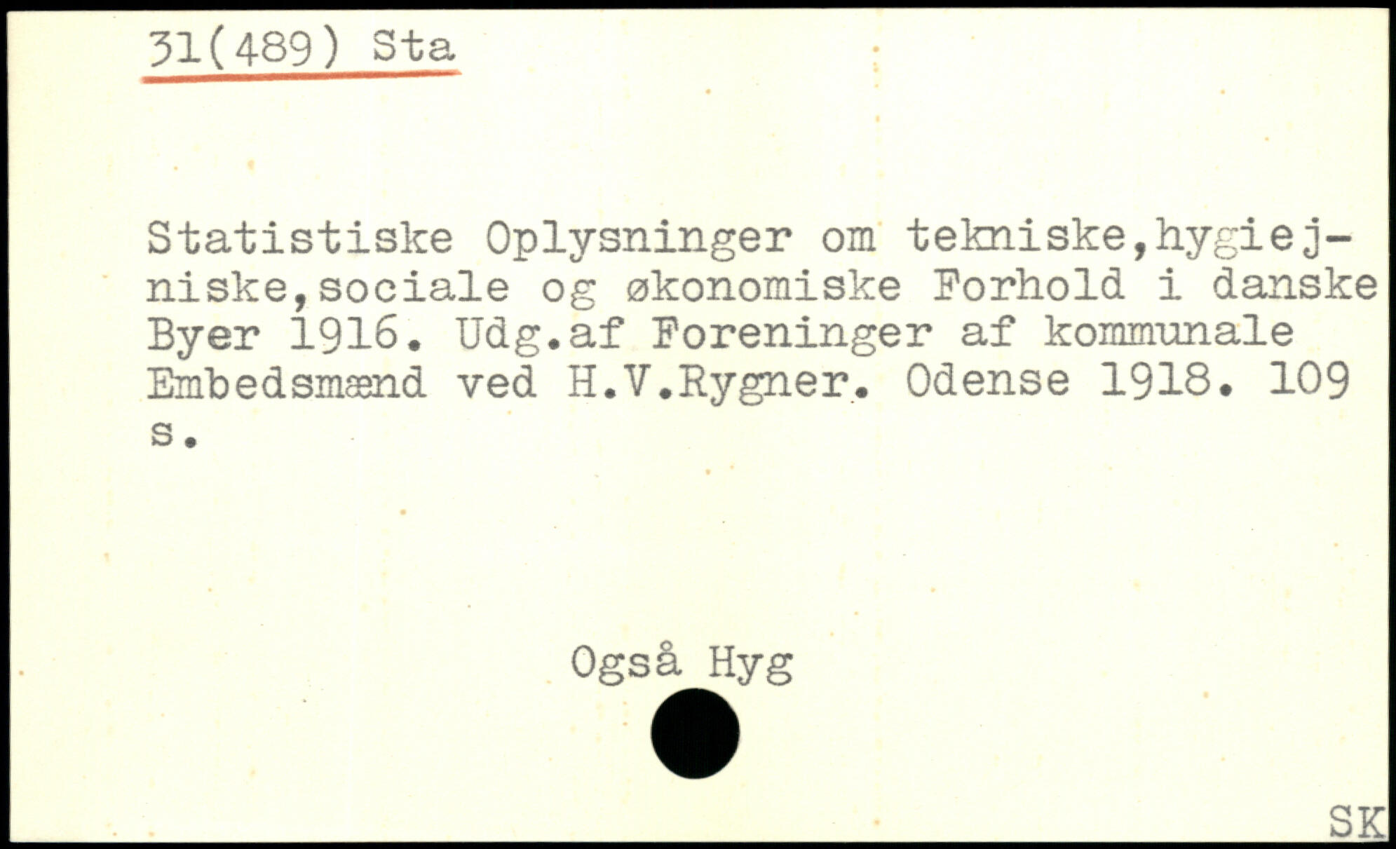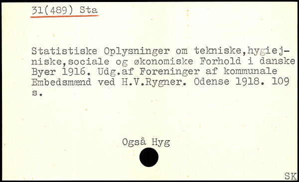 Statistiske Oplysninger om tekniske,hygiej-niske,sociale og økonomiske Forhold i danske Byer 1916, Udg.af Foreninger af kommunale Embedsmand ved H.V.Rygner. Odense 1918
