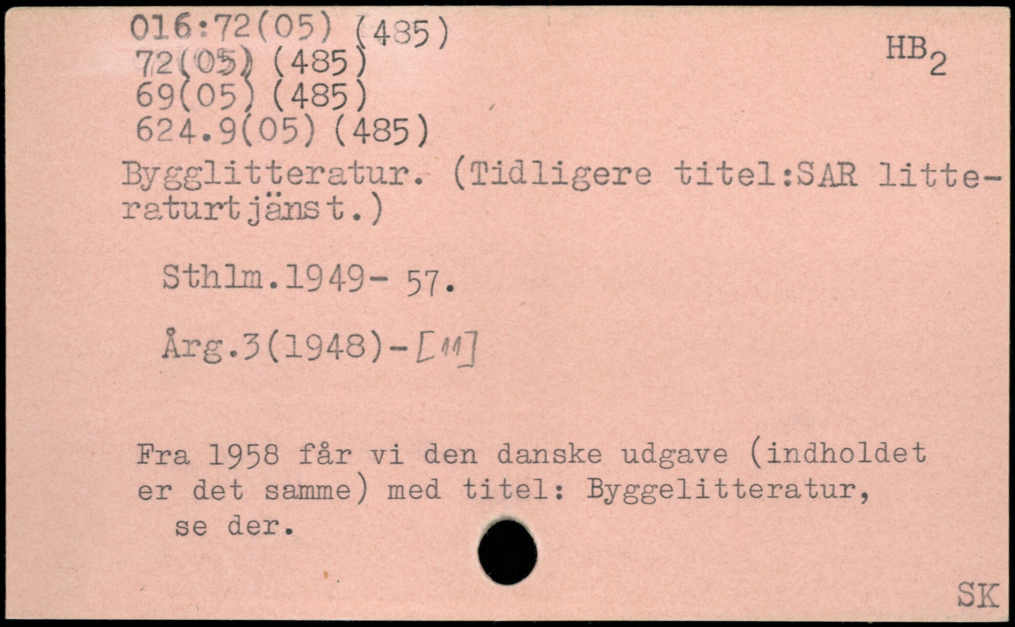 Elygglitteratur. (Tidligere titel:SAR litteraturt janst. ) SthLn.1949“ 57. Årg.5(1948)- C Fra 1958 får vi den danske udgave (indholdet er det samme) med titel: Byggelitteratur, se der.