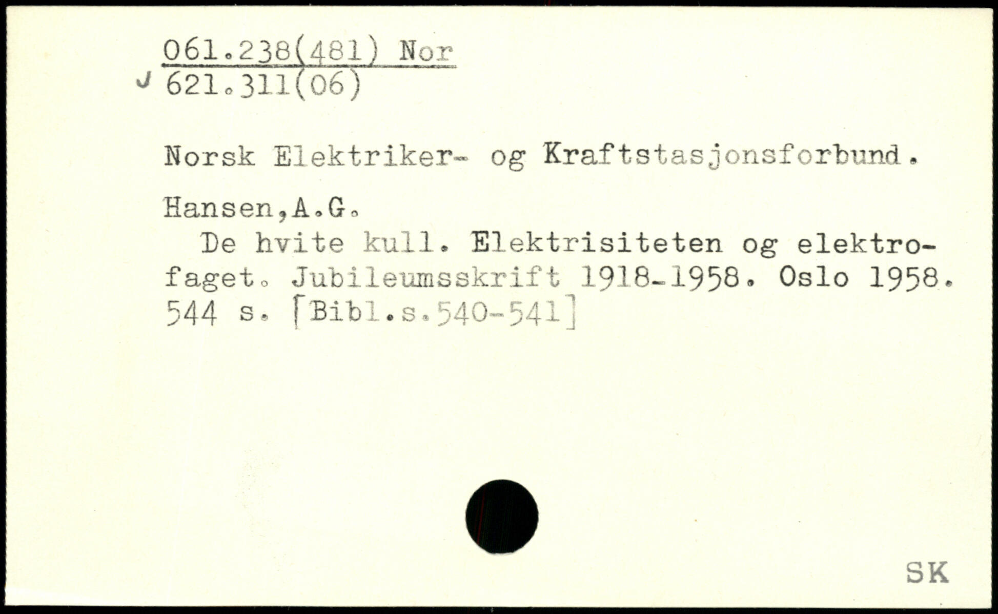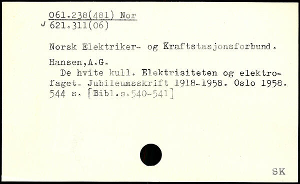 Norsk Elektriker- og Kraftstasjonsforbund. Hansen,A.G. He hvite kull. Elektrisiteten og elektrofaget. Jubileumsskrift 1918-1958. Oslo 1958.