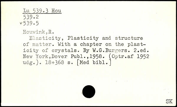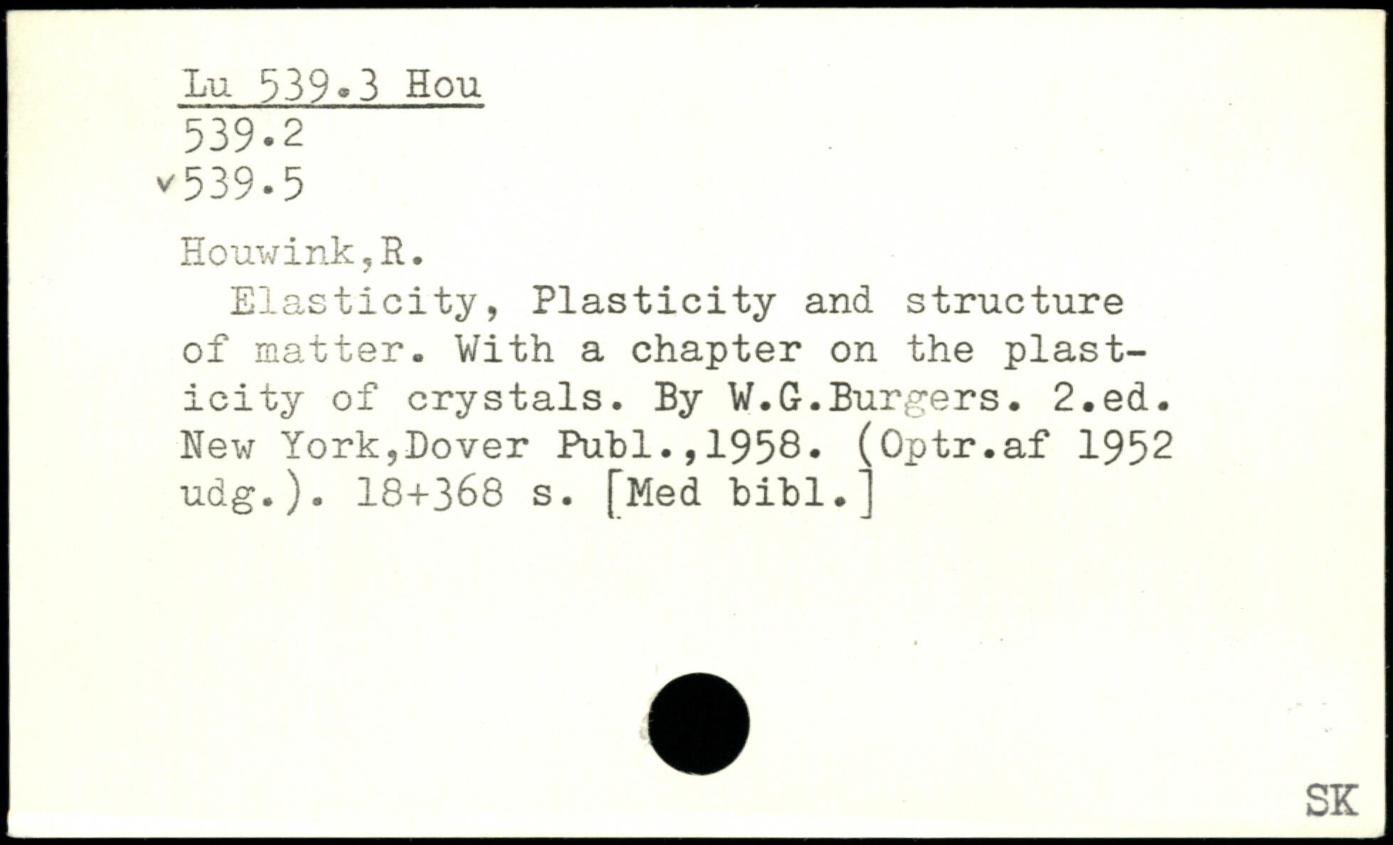 Elasticity, Plasticity and structure of matter. With a chapter on the plasticity of crystals. By W.G.Burgers.