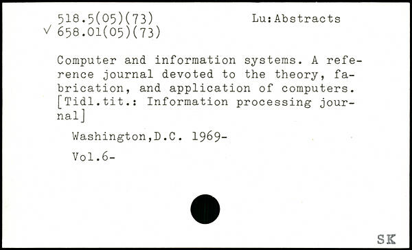 Computer and information systems. A reference journal devoted to the theory, fabrication, and application of computers. [Tidl.tit.: Information processing journal] Washington,D.C. 1969-