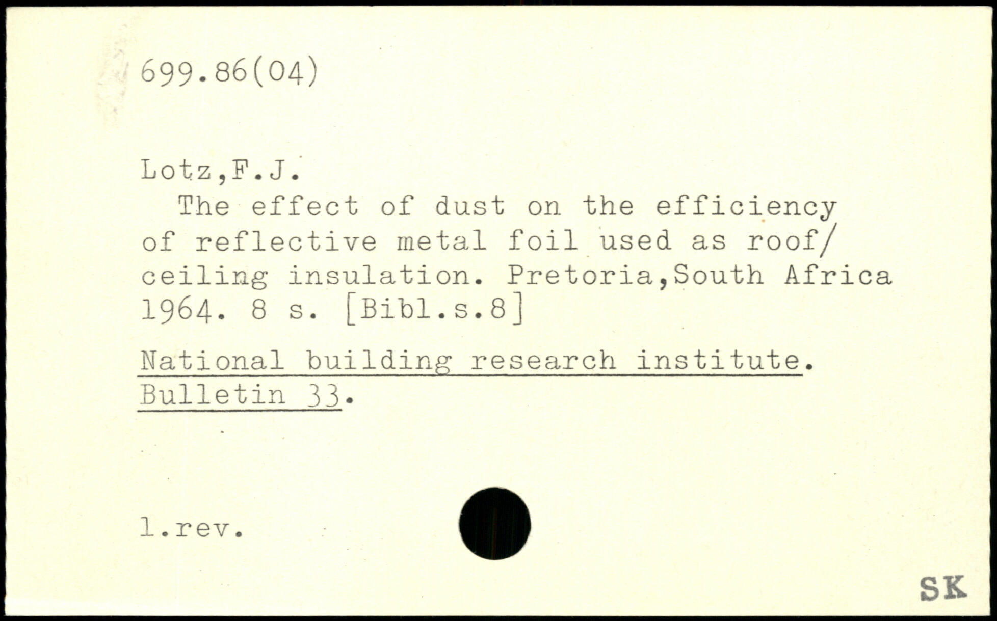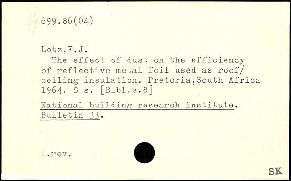 The effect of dust on the efficiency of reflective metal foil used as roof/ ceiling insulation. Pretoria,South Africa 1964.