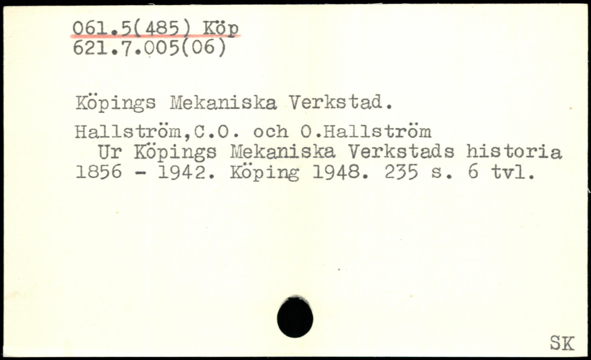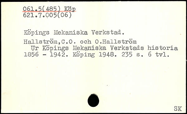 Köpings Mekaniska Verkstad. Hallström,C.O. och 0.Hallström Ur Köpings Mekaniska Verkstads historia 1856 - 1942. Köping 1948.
