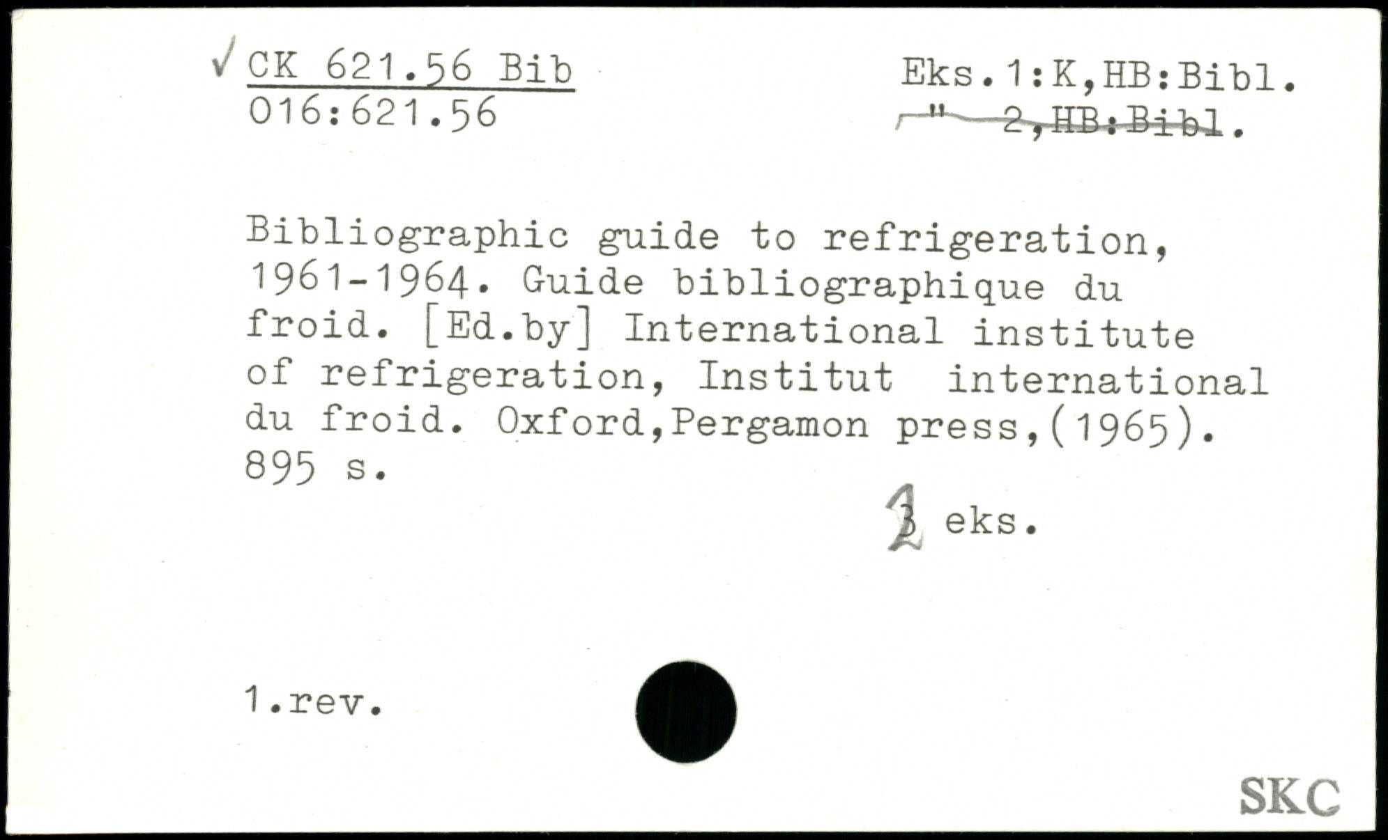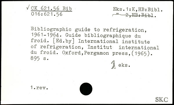 Bibliographie guide to réfrigération, 1961-1964. Guide bibliographique du froid. [Ed.by] International institute of réfrigération, Institut international du froid. Oxford,Pergamon press,(1965).